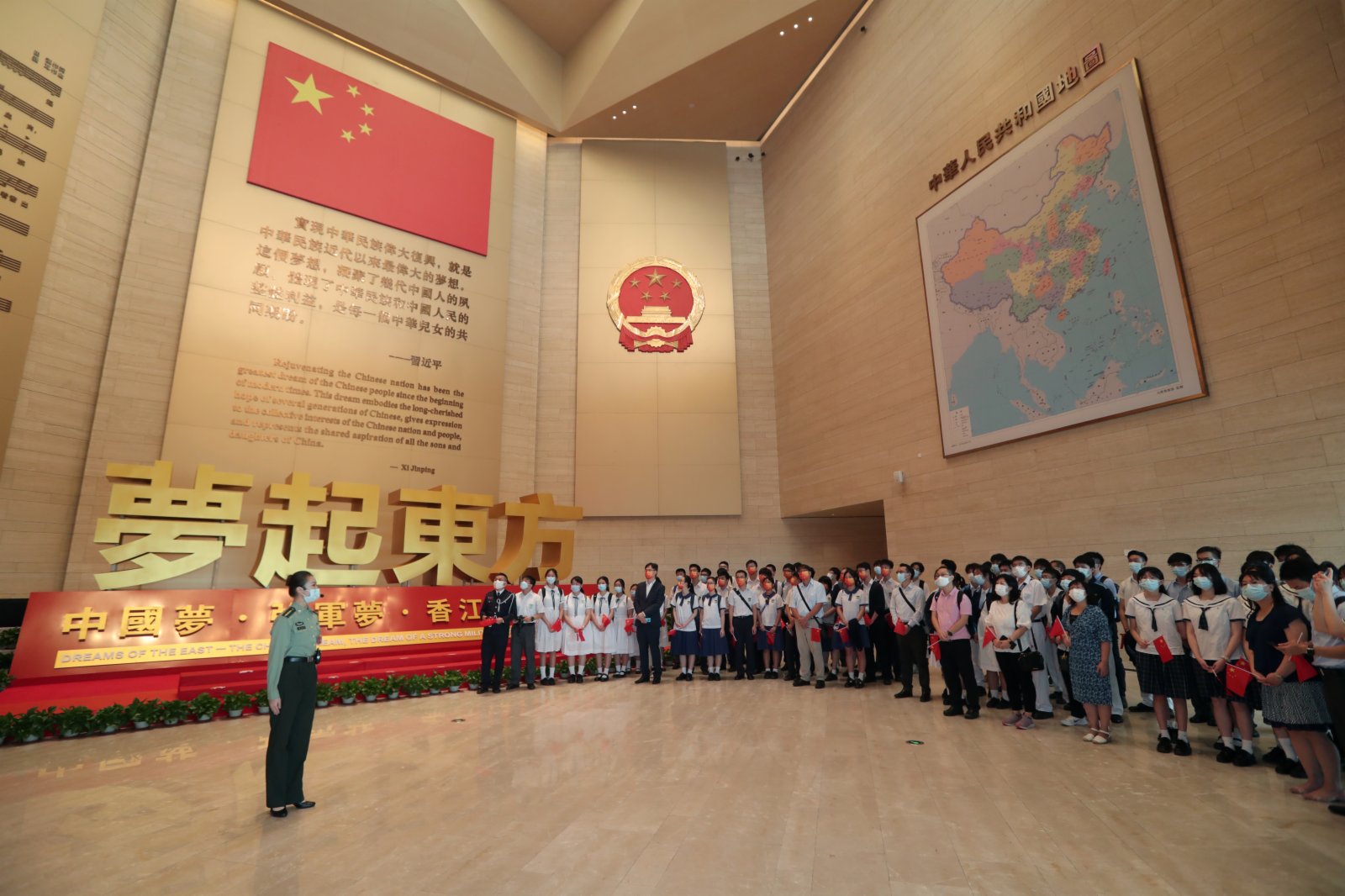 升國旗儀式後,香港師生和市民代表走進駐香港部隊展覽中心,參觀「夢起東方」主題展覽。跟隨着解說員的細緻講解,現場觀眾先後參觀了中國夢展廳、強軍夢展廳、香江衛士展廳和裝備模型展示區,深刻感悟中華民族悠久燦爛文明和中國共產黨領導下復興圖強的輝煌成就,人民軍隊在黨的領導下不斷從勝利走向勝利的光輝歷程,駐香港部隊貫徹「一國兩制」偉大方針、維護香港長期繁榮穩定的生動實踐。