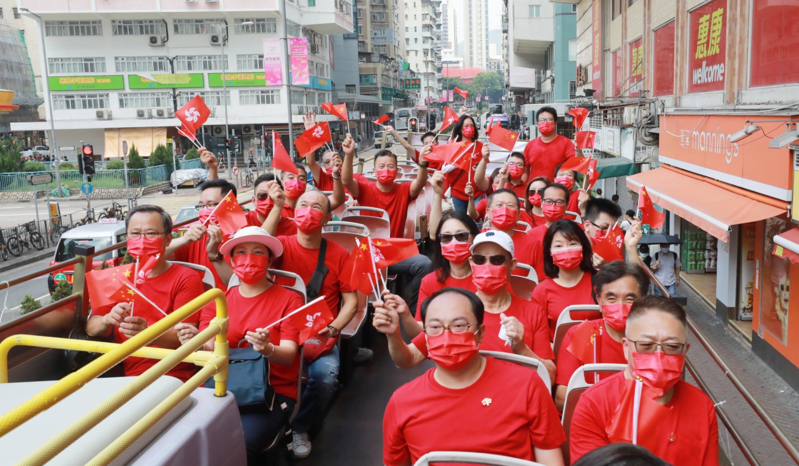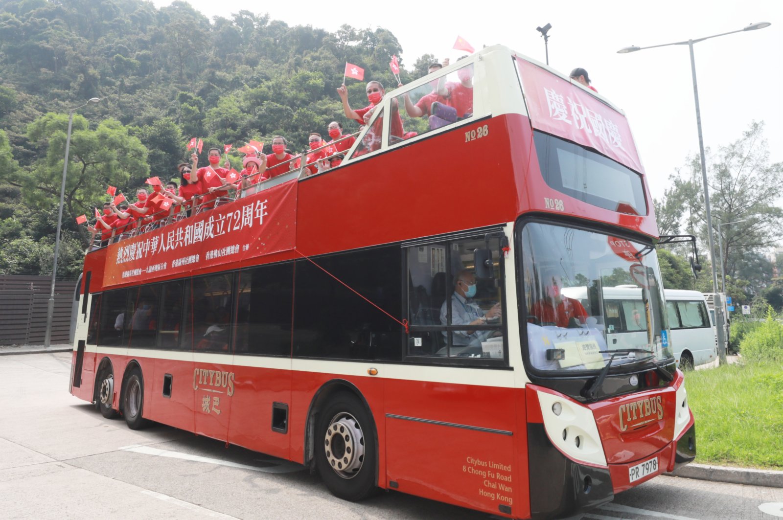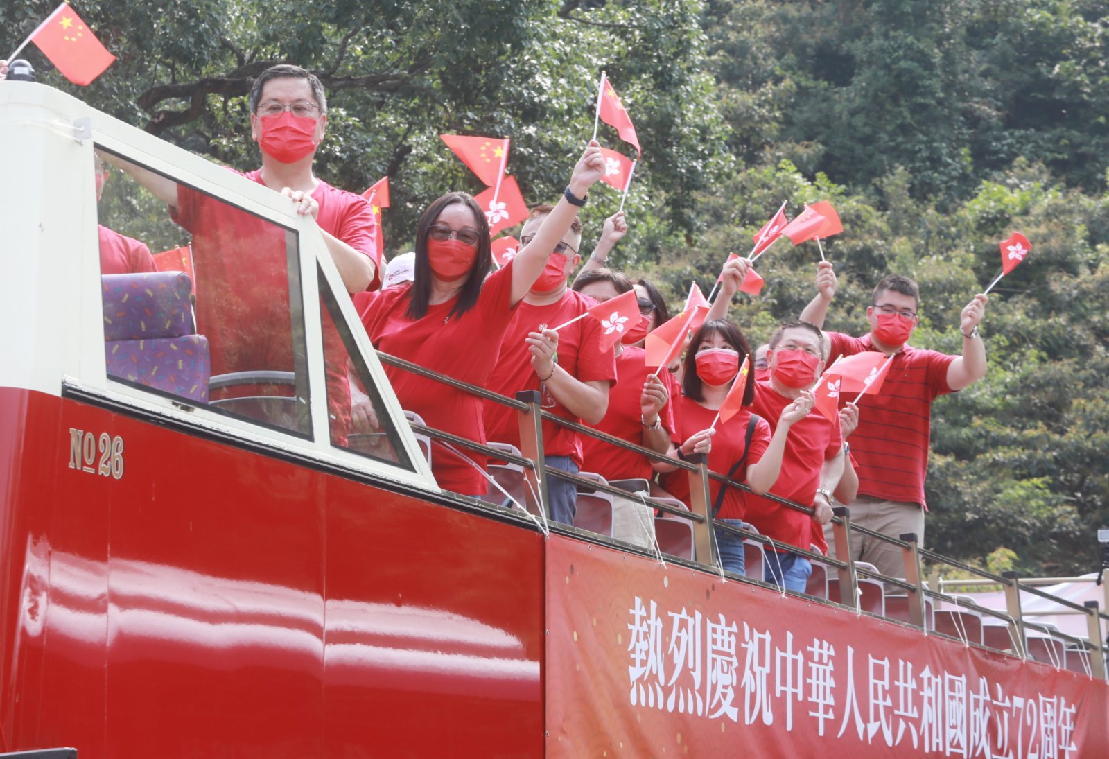大公文匯全媒體報道:今日(1日)是國慶節,為慶祝國慶,今日上午有團體舉行巴士巡遊。一架掛有「熱烈慶祝中華人民共和國成立72周年」橫額的紅色開篷巴士於上午10時從九龍塘出發,沿途經過太子、旺角、油麻地、尖沙咀鬧市,參加者在車上不停揮動國旗區旗,向街道一旁商店的工作人員、巴士站和街道上的市民揮手打招呼,送上國慶祝福。沿途不少市民表現雀躍,同樣揮手致意,亦有人舉機拍照。