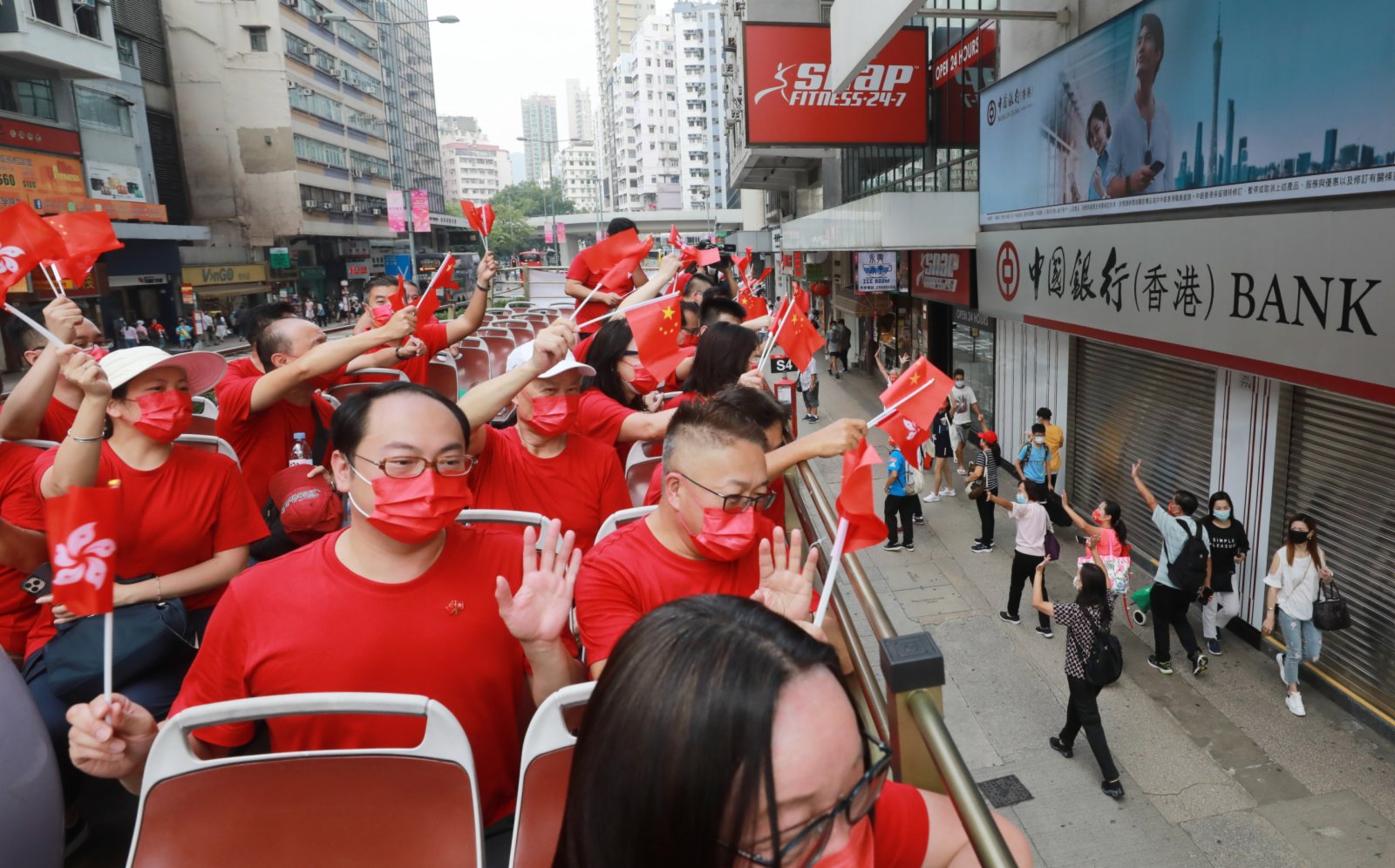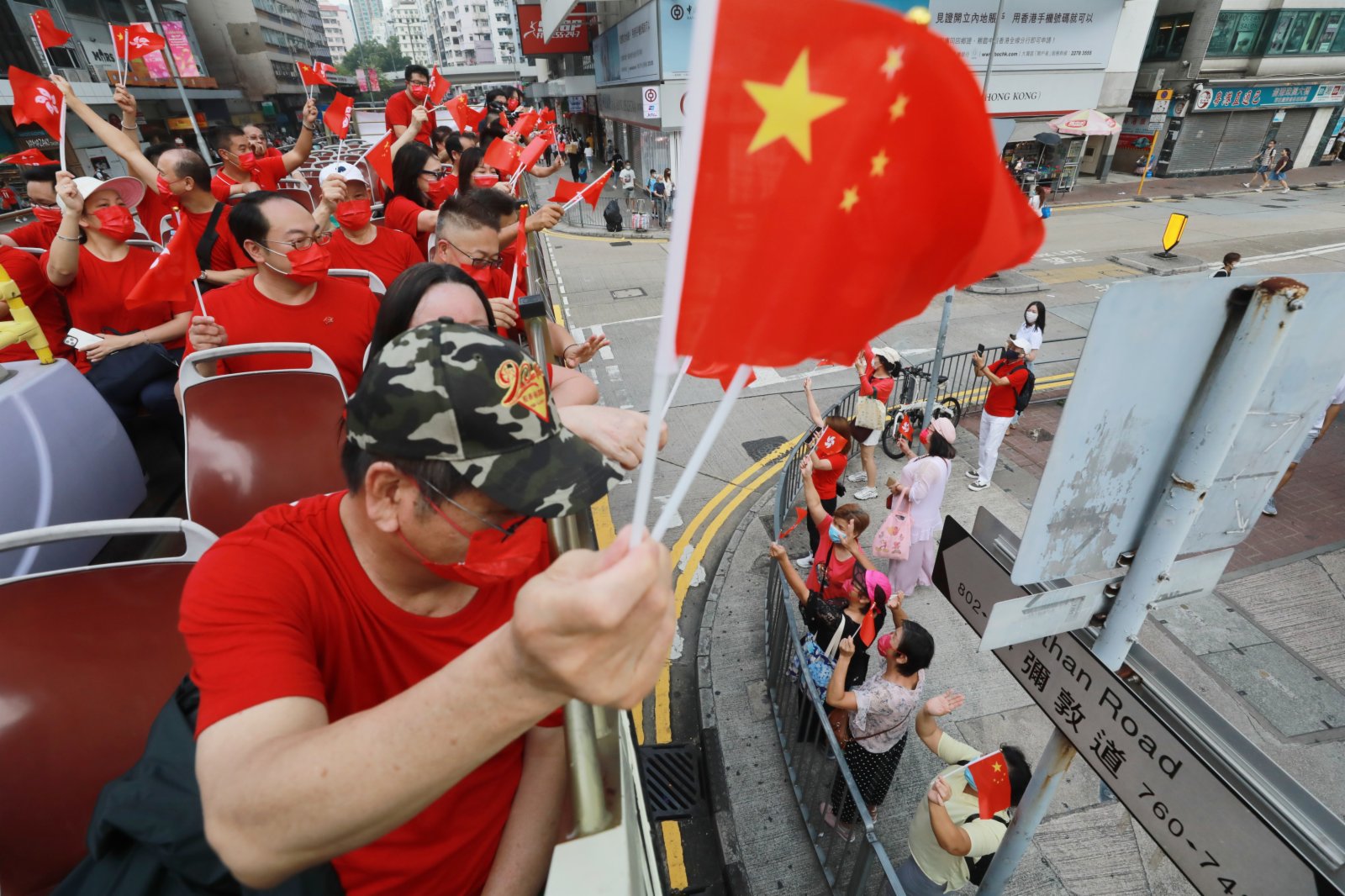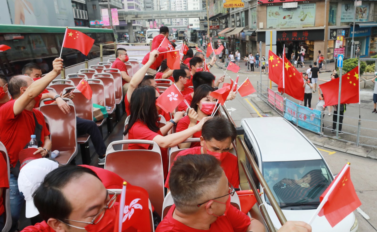 大公文匯全媒體報道:今日(1日)是國慶節,為慶祝國慶,今日上午有團體舉行巴士巡遊。一架掛有「熱烈慶祝中華人民共和國成立72周年」橫額的紅色開篷巴士於上午10時從九龍塘出發,沿途經過太子、旺角、油麻地、尖沙咀鬧市,參加者在車上不停揮動國旗區旗,向街道一旁商店的工作人員、巴士站和街道上的市民揮手打招呼,送上國慶祝福。沿途不少市民表現雀躍,同樣揮手致意,亦有人舉機拍照。