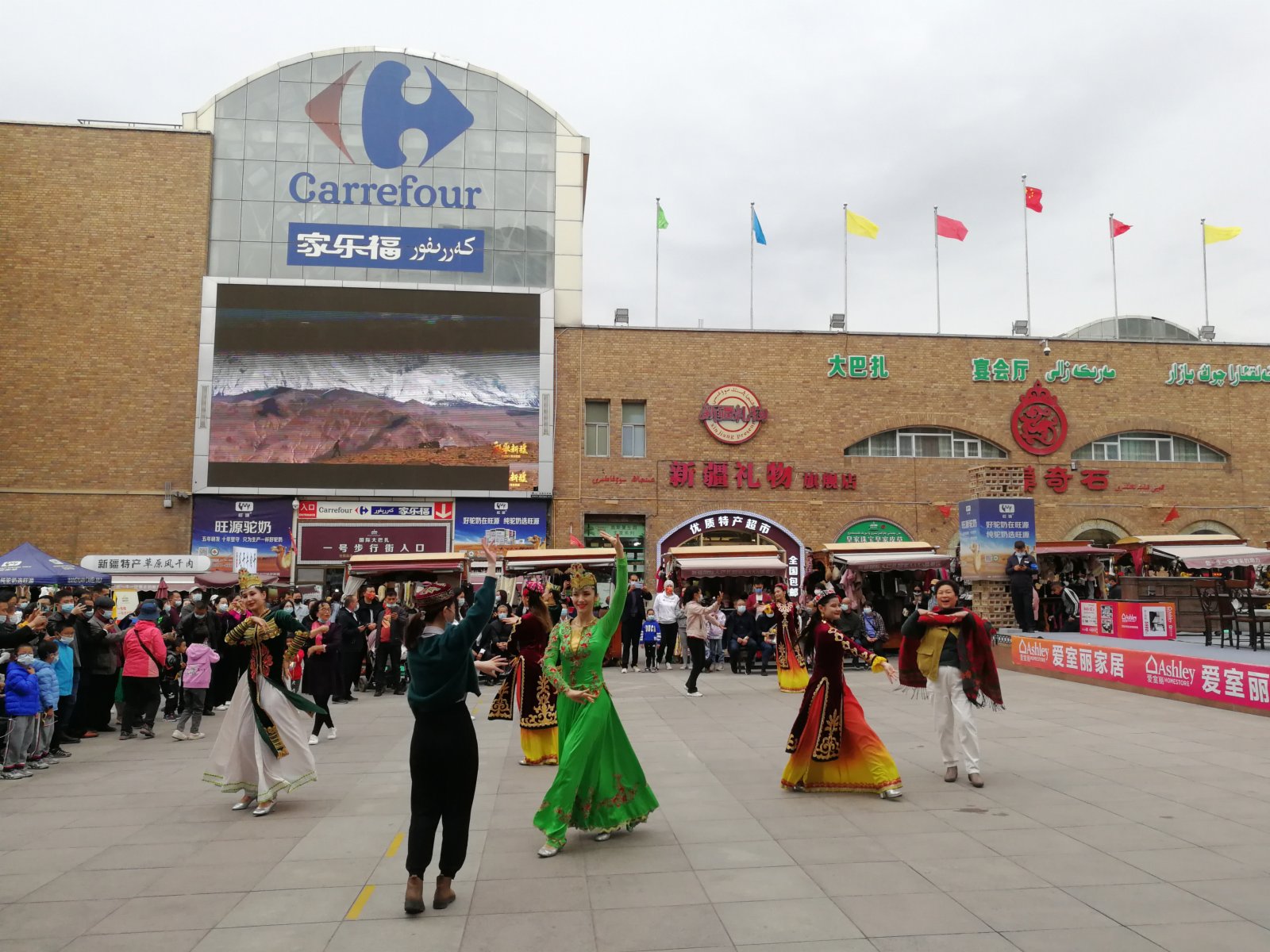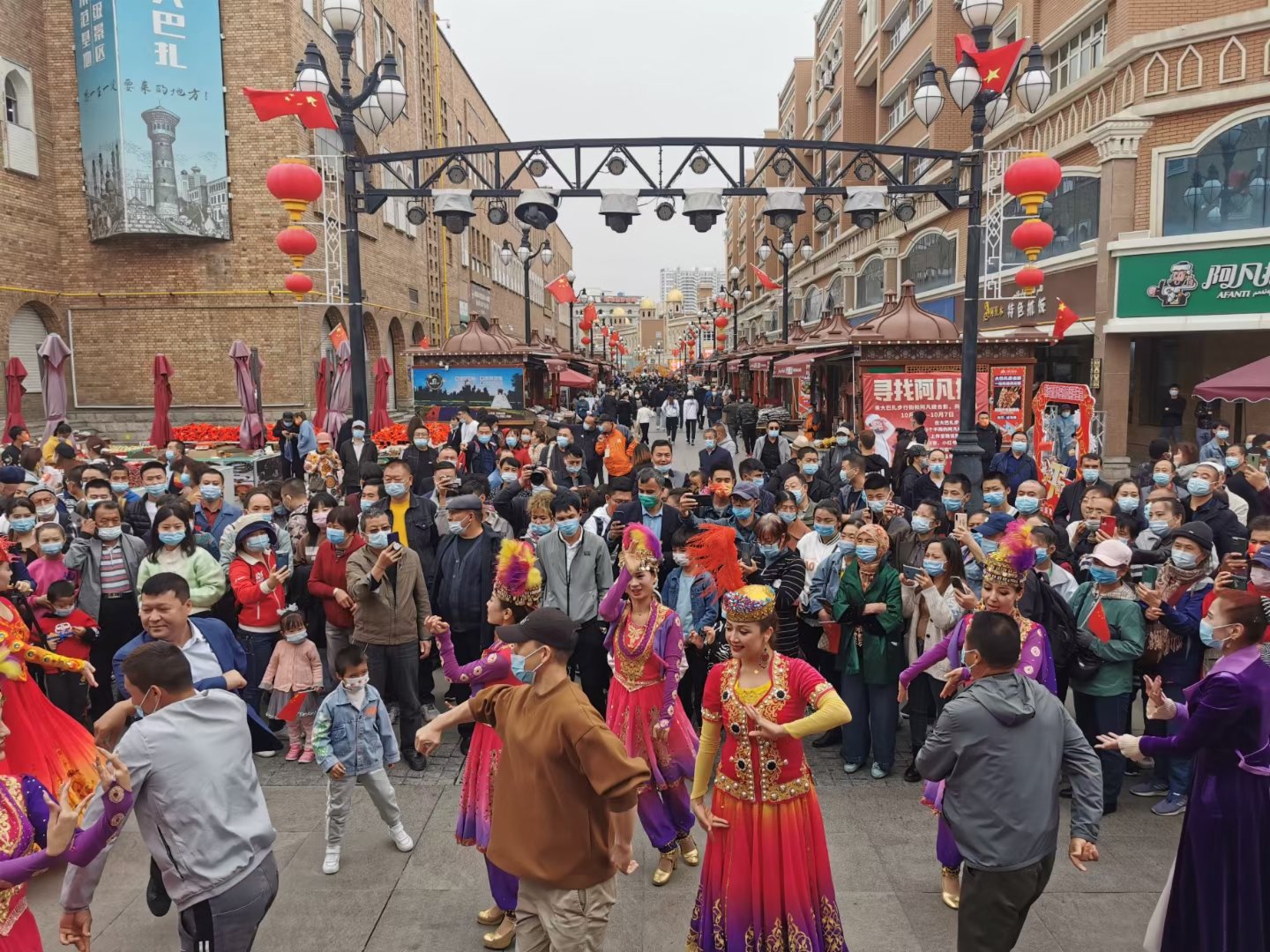 (香港文匯網記者 應江洪 新疆報道)一年一度的國慶長假再度催熱新疆旅遊。10月1日,記者在烏魯木齊市旅遊地標「新疆國際大巴扎」,看到近兩年來因新冠肺炎疫情而難得的人頭攢動景象。其中,既有來自廣東、四川等地的遊客,也有烏市本地和疆內遊客。他們或在品味民族民俗風情濃郁的建築、美食、特色旅遊商品,或融入現場集體舞蹈氛圍,與景區少數民族演員共跳「麥西來甫」。