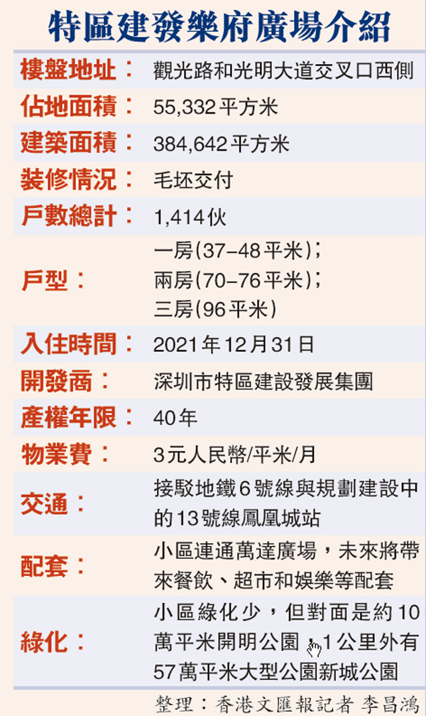 世聯行地產業務員許娟表示,由特區建發集團開發的樂府廣場,緊鄰光明區政府,並無縫接駁深圳地鐵6號線及13號線(預計2022年通車)鳳凰城站。樂府廣場佔地面積約5.5萬平方米,總建築面積約38.5萬平方米,由2棟甲級寫字樓和2棟公寓組成。其中2棟公寓樓高44層,共計有1,400多套房,已經銷售了約500套。目前在售戶型包括37-48平方米的一房、70-76平方米的兩房和96平方米的三房,兩棟公寓分別為7梯16戶和7梯18戶,都為毛坯交樓。