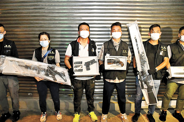 警方於十一國慶節前夕搗破一個「槍械庫」。西九龍總區重案組根據線報及調查,得悉有人在寓所內藏有大批非法槍械及武器,於前晚突擊搜查九龍城一個目標單位,檢獲15支疑經改裝的長短氣槍、一批氣槍配件及刀棍,部分氣槍相信發射功能超出兩焦耳法定限制被視為槍械。警方拘捕一對夫婦,正調查收藏改裝槍械及武器目的,不排除有更多人被捕。●香港文匯報記者 蕭景源