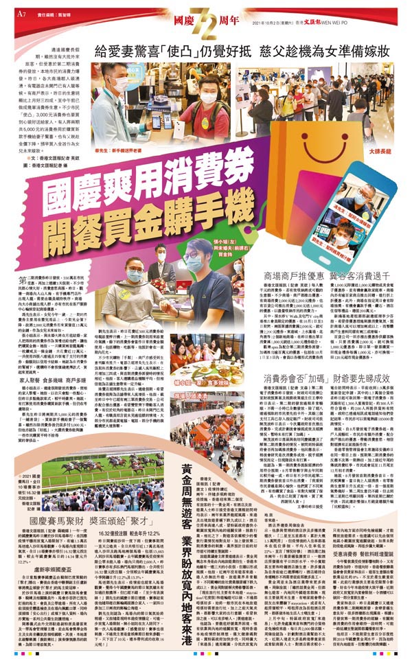 適逢國慶長假期,雖然沒有大批外來旅客,但受惠於第二期消費券的發放,本地市民的消費力爆發。昨日,各大商場都人頭湧湧,有電器店未開門已有人龍等候。有商戶表示,昨日的生意明顯比上月好三四成,至中午前已做成幾單消費券生意。不少市民「使凸」3,000元消費券也要買到心頭好送給家人,有人將兩期共5,000元的消費券用於購買新款手機給妻子驚喜,也有父親趁金價下降,預早買入金器作為女兒未來嫁妝。●文:香港文匯報記者 芙釵 圖:香港文匯報記者 攝