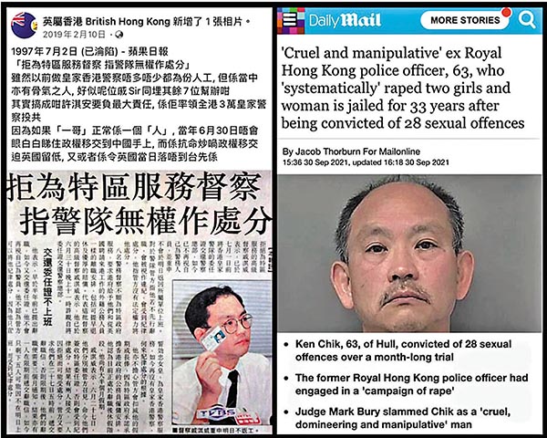 英國《每日郵報》報道,一名於上世紀九十年代移民英國的63歲前香港警員Ken Chik,在英國東約克郡侯城(Hull)聯同一名37歲港籍女子有組織地干犯多宗性罪行,經過審訊後,被裁定28項強姦、性侵犯、與兒童發生性行為、導致兒童參與性行為以及虐待等罪成,判監33年。新聞一出,一眾香港黃絲即大肆抹黑香港警隊,但有人就翻查資料,發現該名Ken Chik疑為香港回歸前公開拒絕為特區政府服務的高級督察戚淇威,可以說是「第一代」的黃絲,今次班黃絲真係炒晒車囉。
