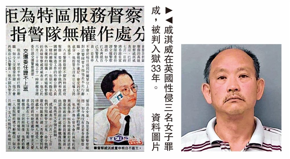 (大公報訊)英國東約克郡赫爾(Hull)皇室法院於上周三(9月29日)裁定,一名63歲前皇家香港警察Ken Chik涉及性侵三名女子,最終被判入獄33年。同案另一被告,37歲香港女子Tracy Choi被判入獄8年。有網民發現,Ken Chik原來是1997年6月在前民主黨立法會議員涂謹申陪同下高調開記招的高級督察戚淇威,他當時聲稱只忠於英女王,拒絕在香港回歸後為特區政府服務。網民揶揄,戚淇威可以一世食「皇家飯」(入獄)了。