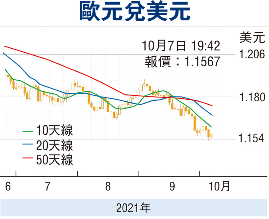 歐元本周初受制1.1640美元水平走勢偏軟,周三曾走低至1.1530美元附近,周四呈現反彈,一度重上1.1570美元水平。歐盟統計局上周五公布歐元區9月份通脹年率初值攀升至3.4%,連續3個月顯著上升,通脹升幅趨於擴大,歐元本周初曾向上觸及1.1640美元水平。不過美元指數本周二及周三表現偏強,加上德國聯邦統計局本周三公布8月份製造業訂單按月下跌7.7%,同日美國公布9月份ADP就業人數增幅高於預期,歐元反而一度下跌至1.1530美元水平逾14個月低位。