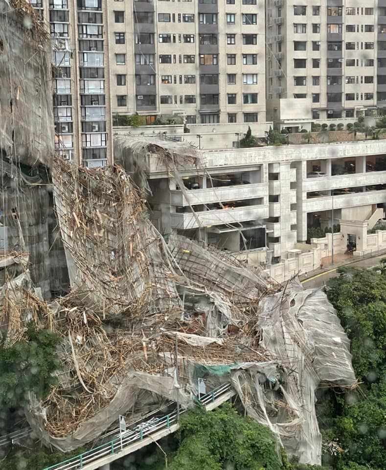 大公文匯全媒體報道:天文台今早(8日)發出三號強風信號,早上10時16分,跑馬地發生棚架倒塌意外,樂活道一幢大廈外牆的巨型棚架倒下,墮下的棚架阻礙來回行車線,部分跌落山坡及鄰近屋苑平台,兩輛汽車駛經被棚架壓着被困。現場5男2女工人在意外後一度失去聯絡,消防派出坍塌搜救專隊到場協助搜索。