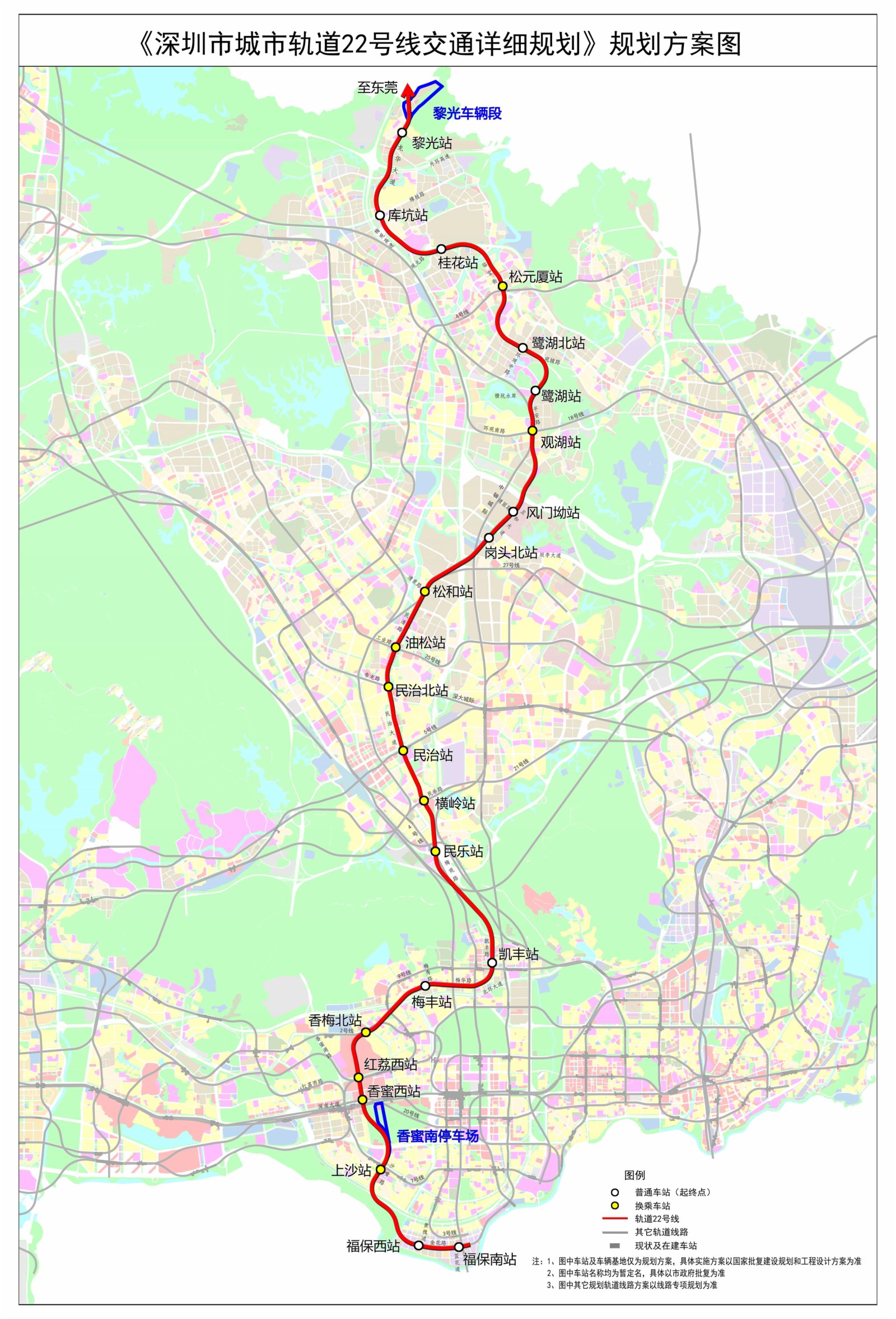 根據規劃方案,軌道22號線起於福保南站,終止於黎光站,沿線途經福田、龍華和龍崗3個行政區,聯繫福田保稅區、車公廟、香蜜湖、梅林、民治、阪雪崗、鷺湖和觀瀾等片區,並預留延伸至東莞的條件。規劃線路全長約38公里(深圳境內),採用全地下敷設方式,共設車站23座,其中換乘站12座,分別與軌道2號線、4號線、5號線、6號線、7號線、18號線、21號線、24號線、25號線、27號線以及深大城際、深廣中軸城際等線路換乘。