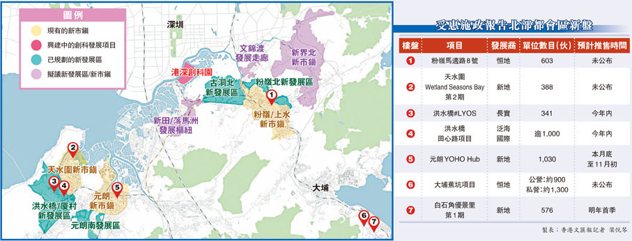 受惠擬建洪水橋/厦村至深圳前海的港深西部鐵路,長實於洪水橋#LYOS正待批預售樓花同意書,有望今年內推售,項目共有341伙;泛海國際旗下洪水橋田心路、洪元路及洪安里住宅發展項目亦預計今年內推售,涉逾1,000伙。此外,新地於元朗YOHO Hub,亦提供1,030伙,有望本月底至11月初推出,同系天水圍Wetland Seasons Bay第2期已申請預售樓花同意書中,提供388伙。