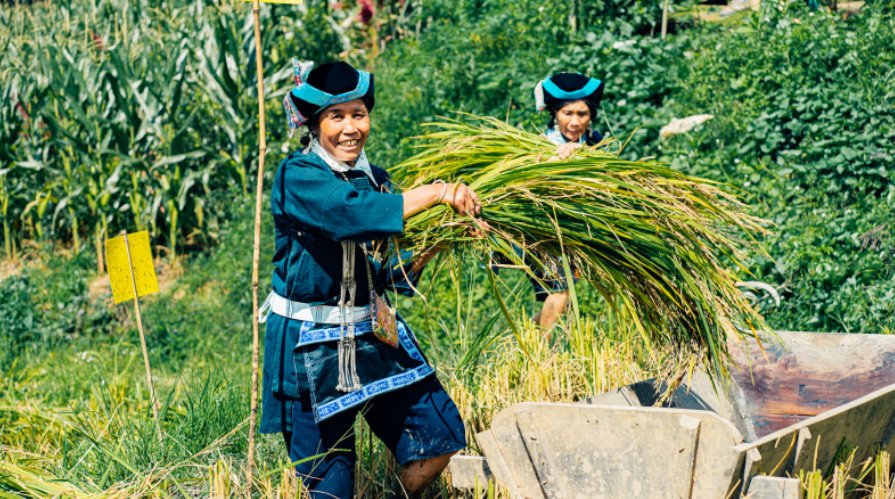 正值收穫季節,在雲南普洱墨江癸能村的紫米種植地裏,沉甸甸的稻穗壓低了稻桿,李元美和鄉親們在田間手工收割打穀,遵循哈尼族的傳統農耕文化,鄉親們每年在豐收打穀的時候都會保留稻穗飽滿的紫稻穀作為種子,留作第二年複種。在港資背景恒生銀行(中國)有限公司(「恒生中國」)的幫助下,這些傳統的紫米種子「藏種於民」,李元美不再擔心沒有人種紫米而吃不到「小時候的味道」,中國傳統的這一種質資源也得到了有效的保護。