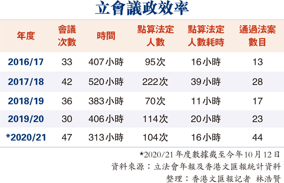 香港文匯報綜合立法會過往年報及自行統計的資料後發現,雖然第六屆立法會繼續履職這一年的會期較過往多了近3個月,會議次數增加,但在議會高效運作下,會議時間反而減少,議會的效率大大提高,通過了更多惠民議案(見表)。