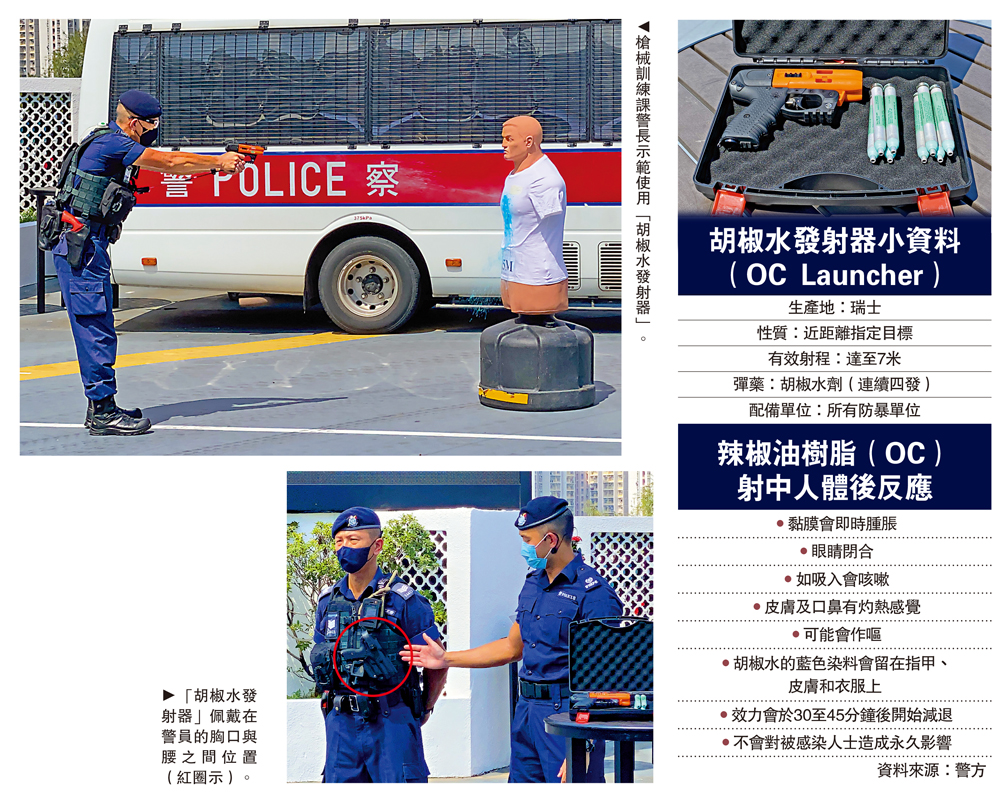 (大公報記者 黃浩輝、突發組)為應對未來可能發生的黑暴事件,防止暴徒襲擊市民和警察,警方由瑞士引入一款低殺傷力新武器「胡椒水發射器」。警方將於本月中起進行為期三個月的實地測試計劃,先由港島總區衝鋒隊前線人員配備胡椒水發射器執勤。