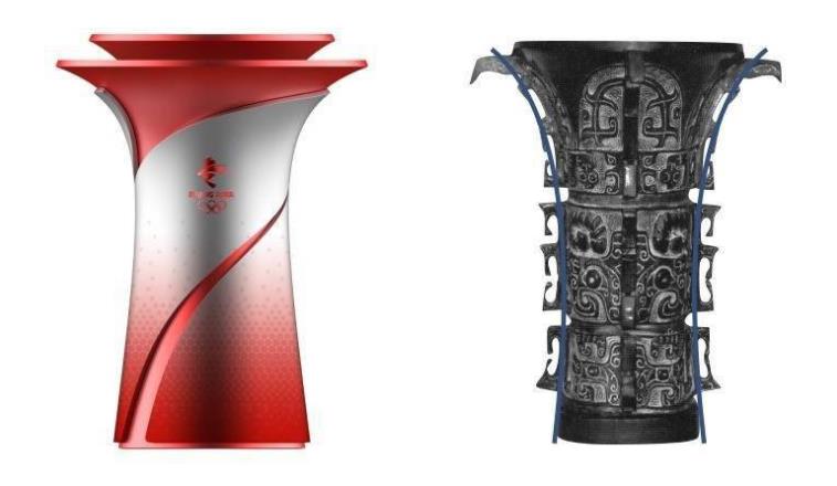 北京冬奧會儀式火種台的創意靈感來自中國傳統青銅禮器——尊,造型風格與火炬、火種燈和諧一致。儀式火種台採用了尊的曲線造型,基座沉穩,象徵「地載萬物」。頂部舒展開闊,寓意着迎接純潔的奧林匹克火種。祥雲紋路由下而上漸化為雪花,象徵了「雙奧之城」的精神傳承。紅色絲帶飄逸飛舞、環繞向上,與火炬設計和諧統一。紅銀交映的色彩,象徵了傳統與現代、科技與激情的融合。