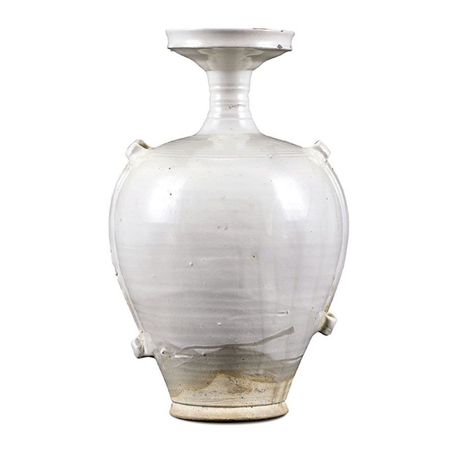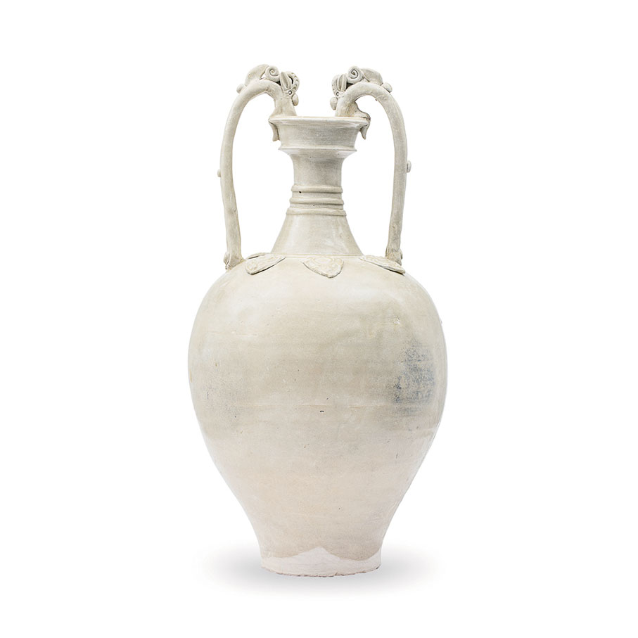 隋唐白瓷有粗細之分,其中粗胎釉色呈灰白、乳白或黃白,而細白瓷則多施滿釉,胎色純白或微微泛青。在筆者的收藏中,亦有一隻唐白釉貼花雙龍飲,此經典器形演變自隋代的雙龍柄雙聯,又結合西域的胡瓶,為唐代所流行,東西交融,風格獨具;另亦收藏了一隻遼白釉穿帶瓶,因唐朝對遼代有着深遠的影響,風格與隋唐白瓷類近,造型豐盈大方,圓唇口、短頸、豐肩、鼓腹。●作者:香港中華文化藝術推廣基金主席 李秀恒