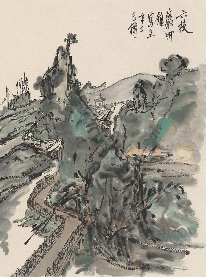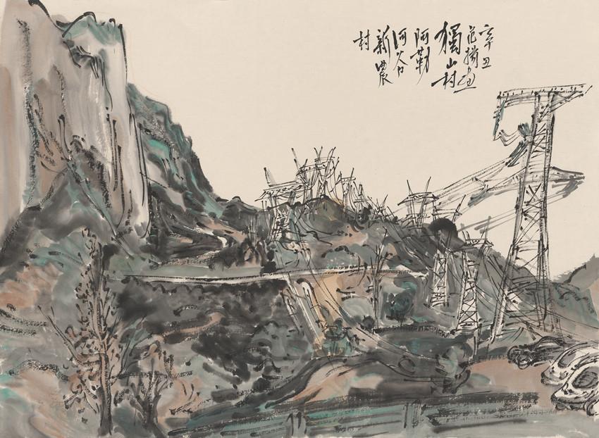 畫成,回首又見橋畔坡岸上,有高壓鐵塔林立叢生,映照在藍天綠野下,大有趣味。我迅捷提筆,揮毫自在,作小畫一幀,題名《阿勒河谷新農村》。
