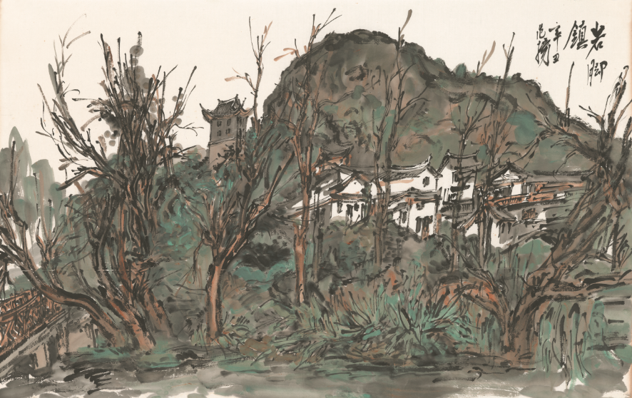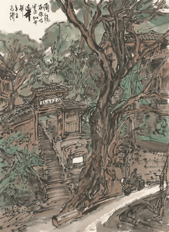 我把碉樓畫了下來,河岸垂柳入水,叢樹背後有民居。我共畫了2件寫生,一繁一簡,各臻其妙。