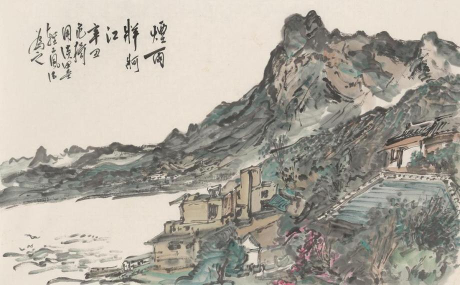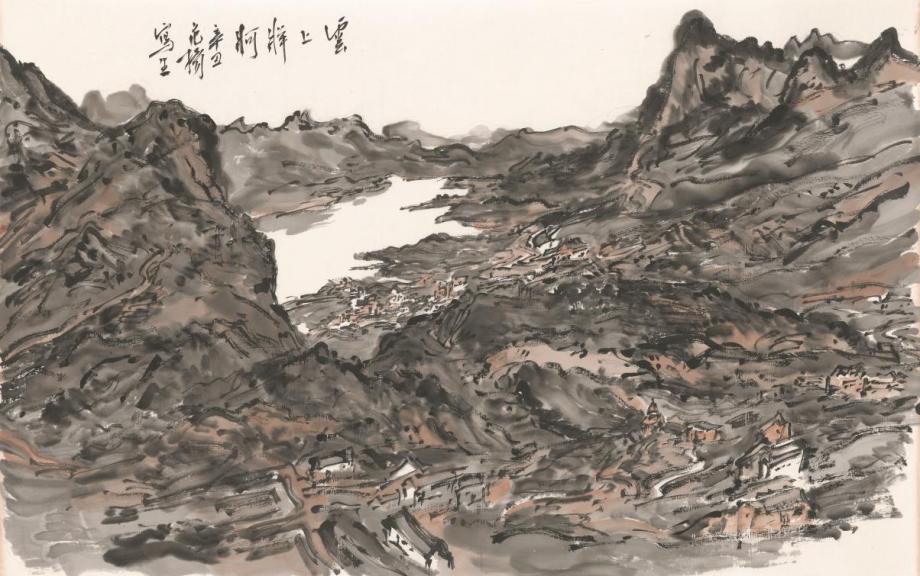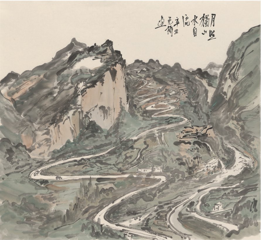 19日上午又到月照鄉獨山村寫生。時霧籠山鄉,峰巒起伏,水流繞山,村屋青蔥。我用淡墨輕嵐小青綠設色為之,畫出點意思,款題《月照獨山水自流》,挺抒情的。