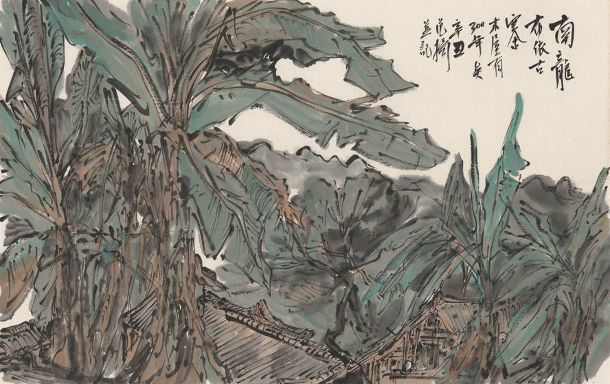 畫完寨門,移步換景,轉身畫山坡下民居。大木屋邊有芭蕉林,很是入畫。接天蕉葉無窮碧,綠蔭深處有人家。我放筆直取,須臾,白描搞成。助手楊軍大呼停筆留趣,班長友迪說還當加顏色,隨類賦彩。圍觀同學們也各有議論說辭。於是,吾從眾,潤之以色,畫完了,確也畫出了氛圍,效果大佳。