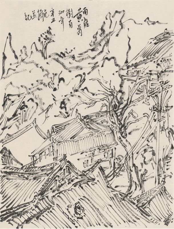 寫生團全天在寨子裏畫畫,我又畫了一件白描,畫了老樹白乾,還有老屋叢樹。
