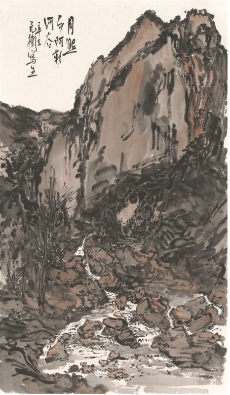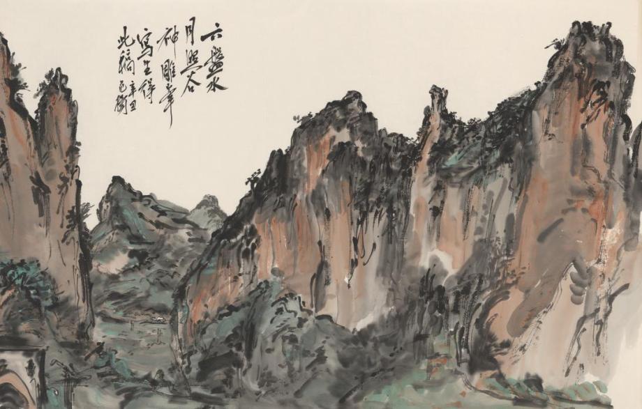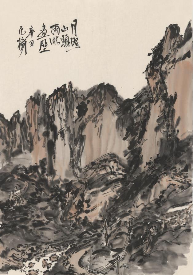 酒後又畫《月照山頭,雨淋畫壁》一件,用淺絳法,墨色淋漓障猶濕,筆法痛快氣已吞。