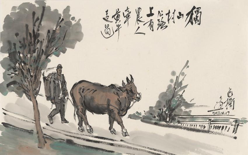 畫成,恰有獨山村村民趕牛回村,我當即畫了下來。人背竹簍,牛身赭黃,煞是好看。人們說「貴州黃牛勝和牛」,說其肉嫩鮮美,勝過日本和牛哉。