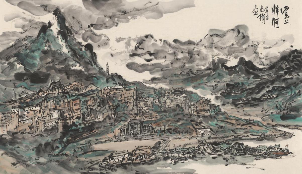 下午回到牂牁鎮。在景區停車場邊的二樓涼台上又畫了一件江景山城。用筆隨意而活潑,率意為之是也。