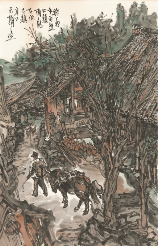其時,有村民牽驢牽馬走過,我就把它畫了下來,山路盡頭有公雞母雞相逐,我也畫了下來。路邊曬着三四十個大南瓜,也入了我的畫面。木屋瓦頂、乾欄樑柱、老樹磴道,眼前種種,入我筆下,成了圖畫。
