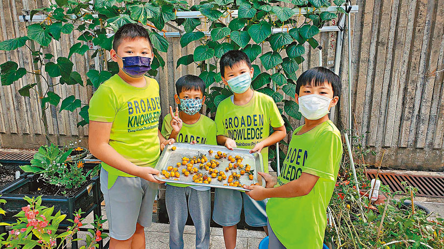 此外,本校設有廚餘機,收集午膳的廚餘,製成有機的花肥用作種植。雖然本學年學生不能在學校午膳,但學校仍鼓勵教職員回收午膳的廚餘,製成種植的肥料。低年級同學透過學習有機種植,使他們明白生態系統的運作及其重要性,以及培養對大自然關愛的情懷。