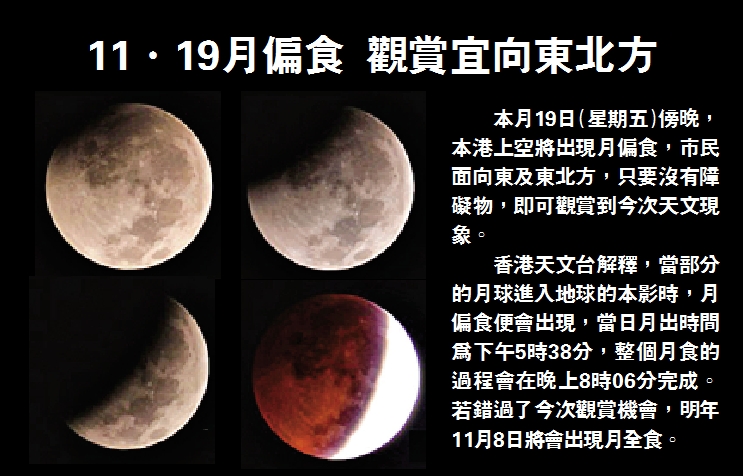 本月19日(星期五)傍晚,本港上空將出現月偏食,市民面向東及東北方,只要沒有障礙物,即可觀賞到今次天文現象。