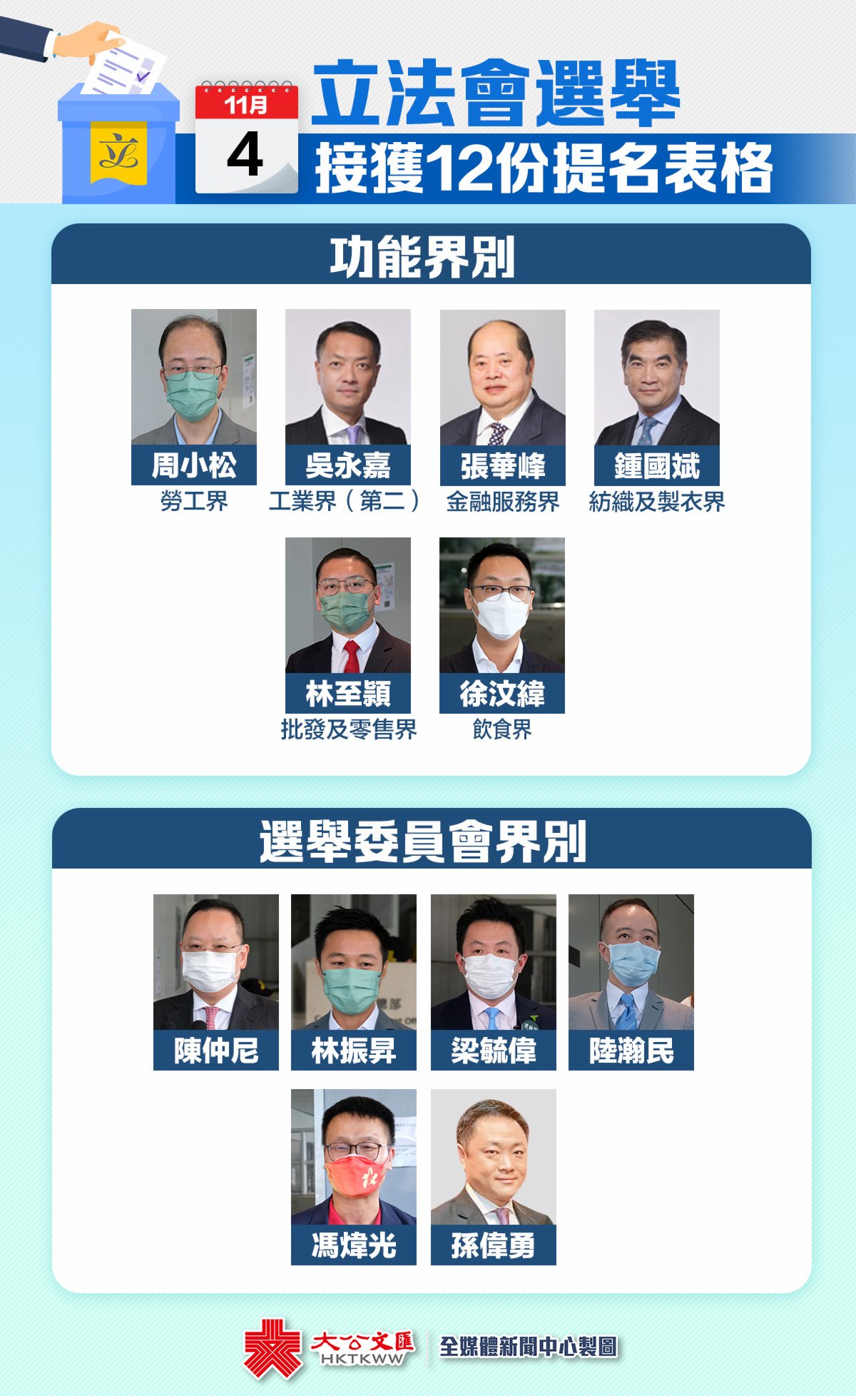 功能界別方面,接獲6份提名表格,包括勞工界的勞聯秘書長周小松;工業界(第二)的經民聯吳永嘉;金融服務界的經民聯張華峰;紡織及製衣界的自由黨鍾國斌;批發及零售界的廣東省政協委員林至穎;以及飲食界的金記控股有限公司主席徐汶緯。