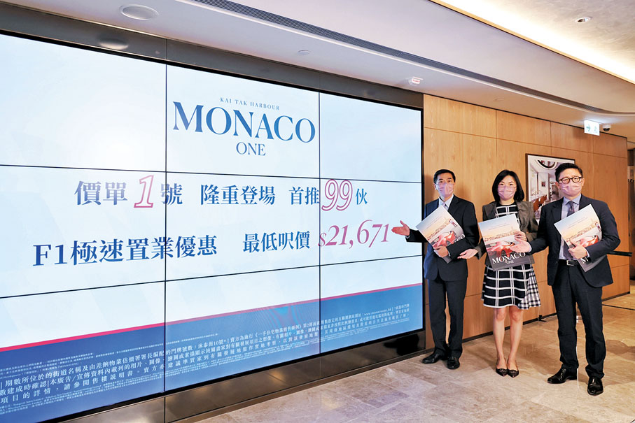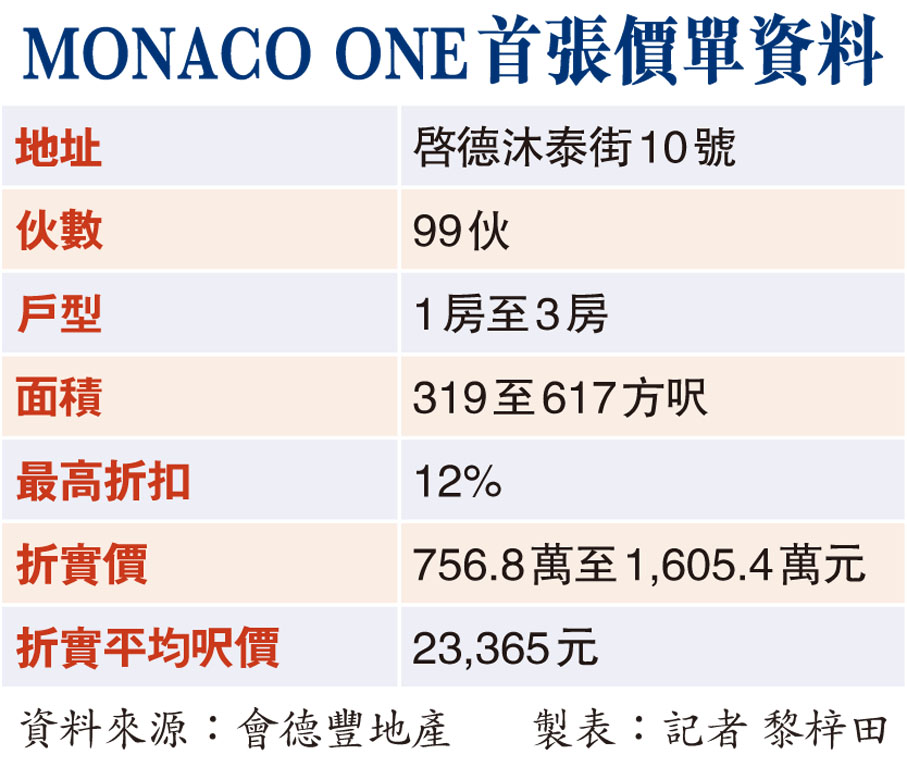 香港文匯報訊(記者 黎梓田)上周末新盤戰況激烈,戰況持續至本周末,並有發展商乘勢加入戰局。會德豐地產啟德項目MONACO ONE昨推出首張價單,涉及99伙,折實平均呎價23,365元,折實價756.8萬元起,整批價單一半單位折實價低於800萬元。常務董事黃光耀在記者會上表示,項目將於本周六開放示範單位並同步收票,最快11月中前開售。代理表示,首批單位定價比同區二手低近一成,比同區一手貨尾低近15%,料銷情理想。