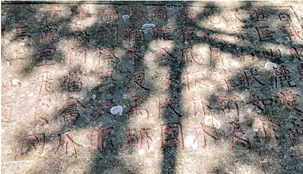 馬占山的詩刻,位於廬山景點之一的「月照松林」。辛丑初秋的一天上午,我帶着一瓶礦泉水,懷着一片景仰情,從柏樹路26號出發,穿過牯嶺街,沿着河南路南行數百米,在松林賓館附近東折轉入寬約2米的「松樹路」,登上80多級台階,來到「月照松林」。但見面對東方的馬占山詩,鐫刻在突出地面斜臥的巨石上。燦爛的陽光,從茂盛的松樹間篩灑而下。我默默地、輕輕地拂去掉在石刻上的松針,全詩清晰可見——橫排豎寫,楷書陰刻,字徑約12厘米。據吳宗慈先生《廬山志》載,此詩由羅鏡仁書、楊祥升刻。品讀全詩,觸景生思,字裏行間蘊含着馬占山抗日殺敵強烈而又無奈的願望。