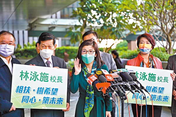 瑪利灣學校校長林泳施昨日報名參選教育界。她表示,在擔任校長以前,自己已經有20年的前線教育工作經驗,近年香港的學生抗壓抗逆能力令人憂慮,教師亦面對不少困難及壓力,情況令人擔心,相信特區政府應有更前瞻性的教育政策,有效幫助教師、家長以至學生本人。
