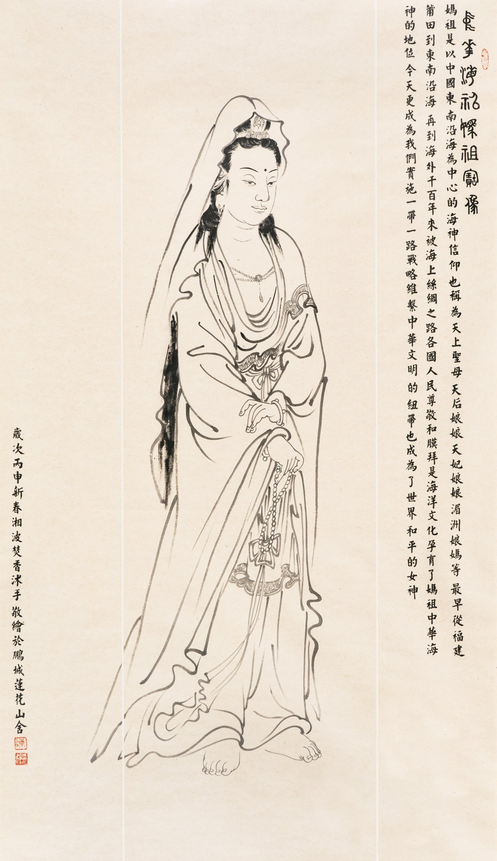 「正心」則是一系列白描作品。陳湘波通過對經典觀音、媽祖形象的反覆描繪,在大型作品中讓觀眾觀賞的過程中獲得類似壁畫繪畫體驗。