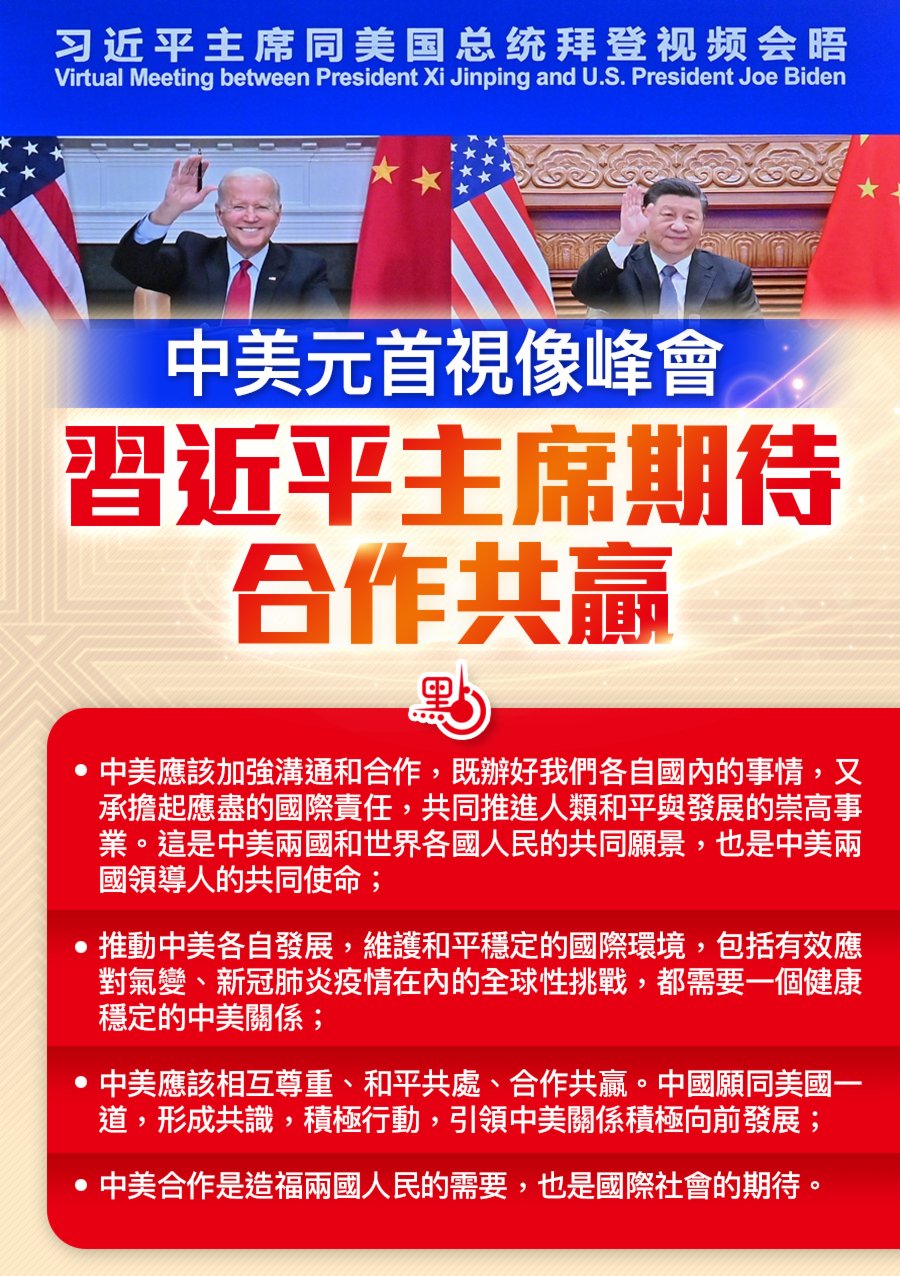 新華社報道,北京時間11月16日上午8時46分(華盛頓當地時間15日19時46分),國家主席習近平與美國總統拜登開始舉行視頻峰會。習近平在會晤中闡明了中方對中美關係的四原則。習近平期待中美互相尊重,和平共處,合作共贏。
