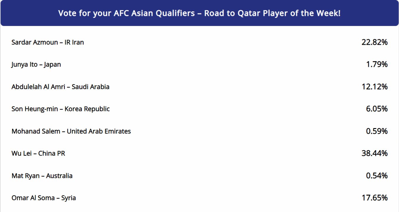 11月20日,亞足聯本周最佳球員投票結束,武磊以38.44%的得票率位列第一,當選本次周最佳球員。在12強賽對陣阿曼和澳大利亞的兩場比賽中,武磊為國足打入兩粒進球。