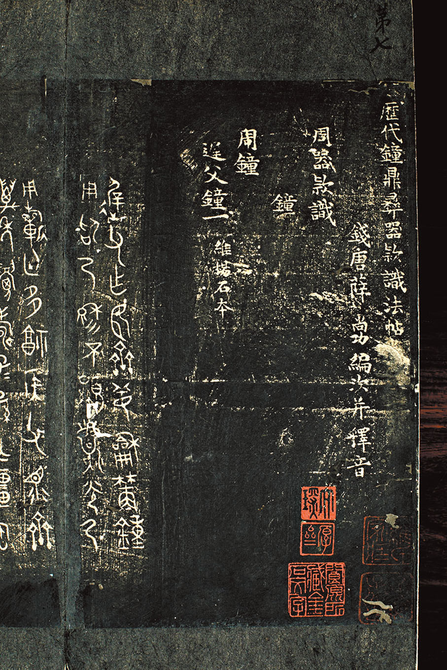 南宋錢塘人(今浙江杭州)薛尚功編次並釋音的《歷代鐘鼎彝器款識法帖》,收集511件銅器款識,刻石置於江州(今江西九江)公庫,是北宋至南宋金學、石刻與法帖之學的發展與交會的稀世物證。薛氏款識宋拓石刻本流傳甚稀,展品中黃丕烈士禮居舊藏十二卷《歷代鐘鼎彝器款識法帖》,為宋刻宋拓、宋代原裝本,首次面向公眾完整展出。