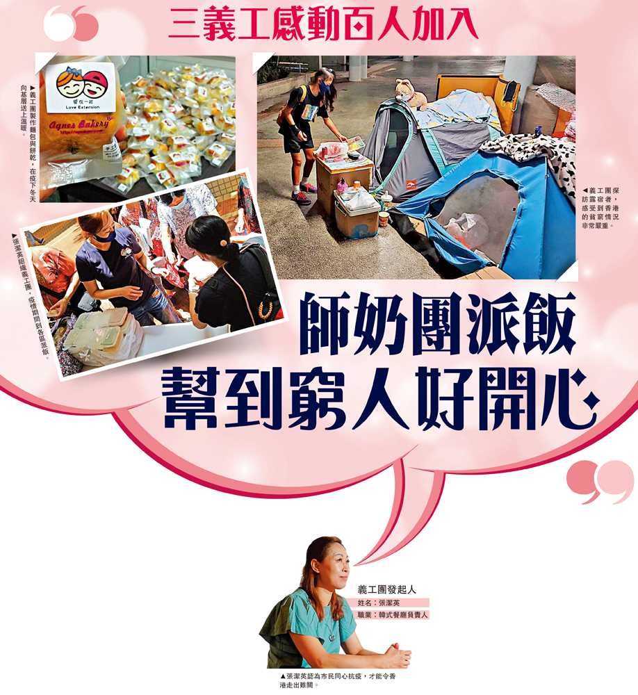眼見市民焦慮捱苦,韓式餐廳負責人兼麵包師傅與兩個年紀相若的媽媽,三個師奶去年四處派口罩及派飯盒扶助貧苦大眾,持續18個月的善舉感動許多人加入做善事,現已壯大成百人義工團,可謂愛心創奇跡。曾目睹一家大細瞓街的義工團發起人張潔英慨嘆「去過派飯,才知窮人有幾慘!社會進步了,但不能忽視窮人!」