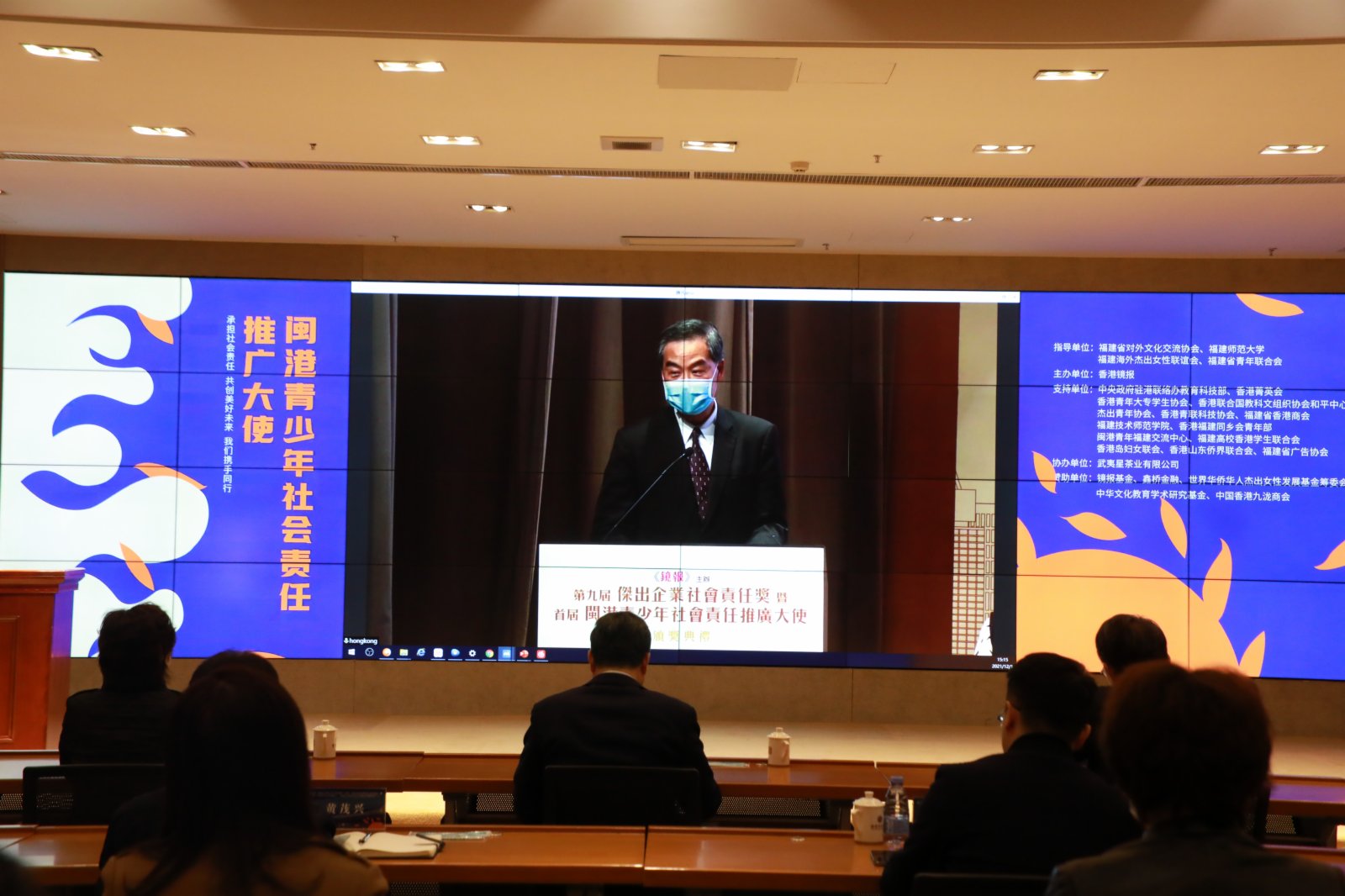 (香港文匯網記者 蘇榕蓉 福州報道)12月1日下午,香港《鏡報》主辦首屆「閩港青少年社會責任推廣大使」評選活動福建賽區頒獎典禮在福建師範大學舉行。頒獎典禮通過連線與直播的方式與香港同步進行,全國政協副主席梁振英、全國僑聯副主席盧文端、中聯辦教育科技部副部長徐凱、前香港教育局局長吳克儉、鏡報執行社長徐新英在香港會展中心出席活動。