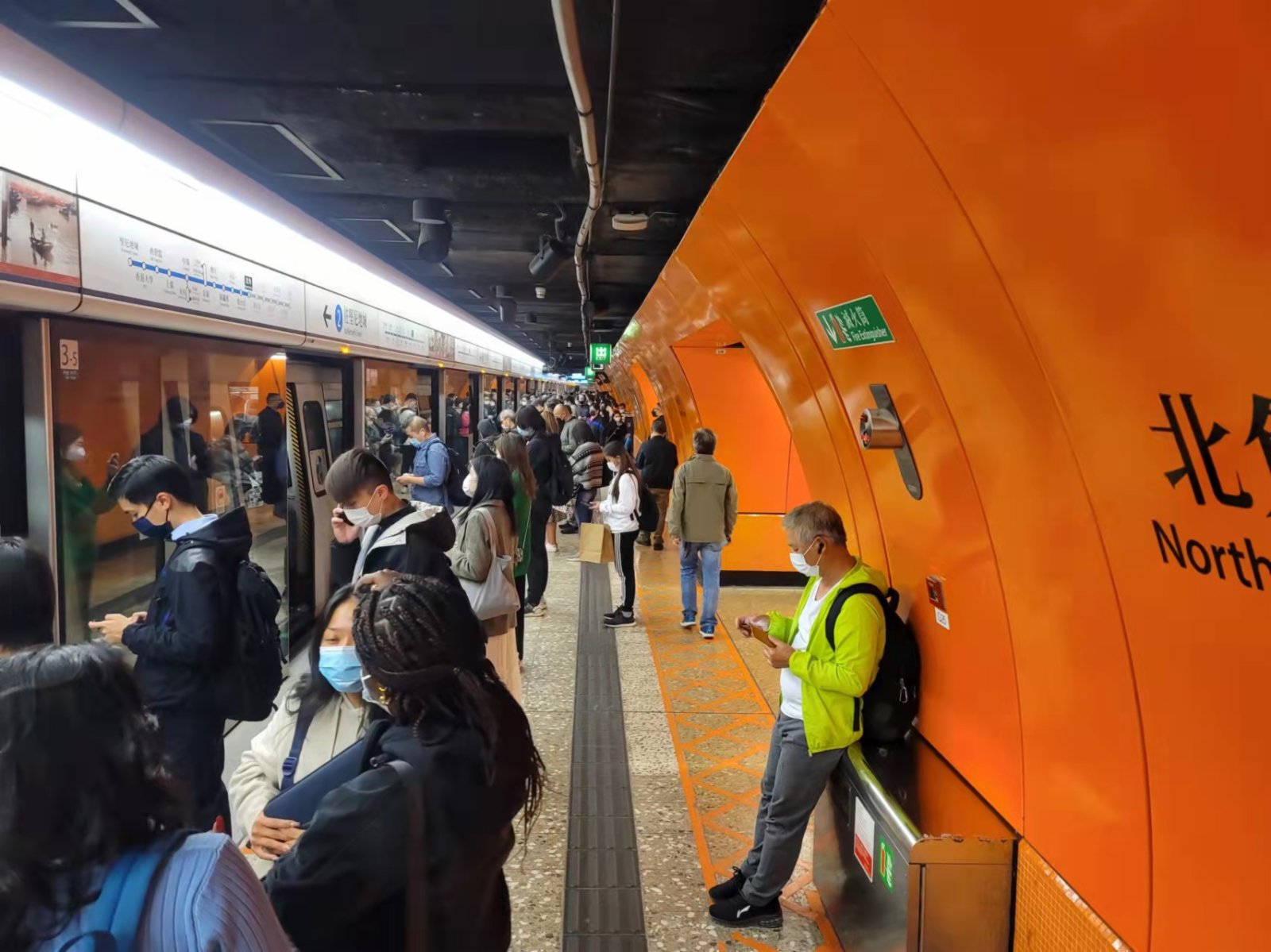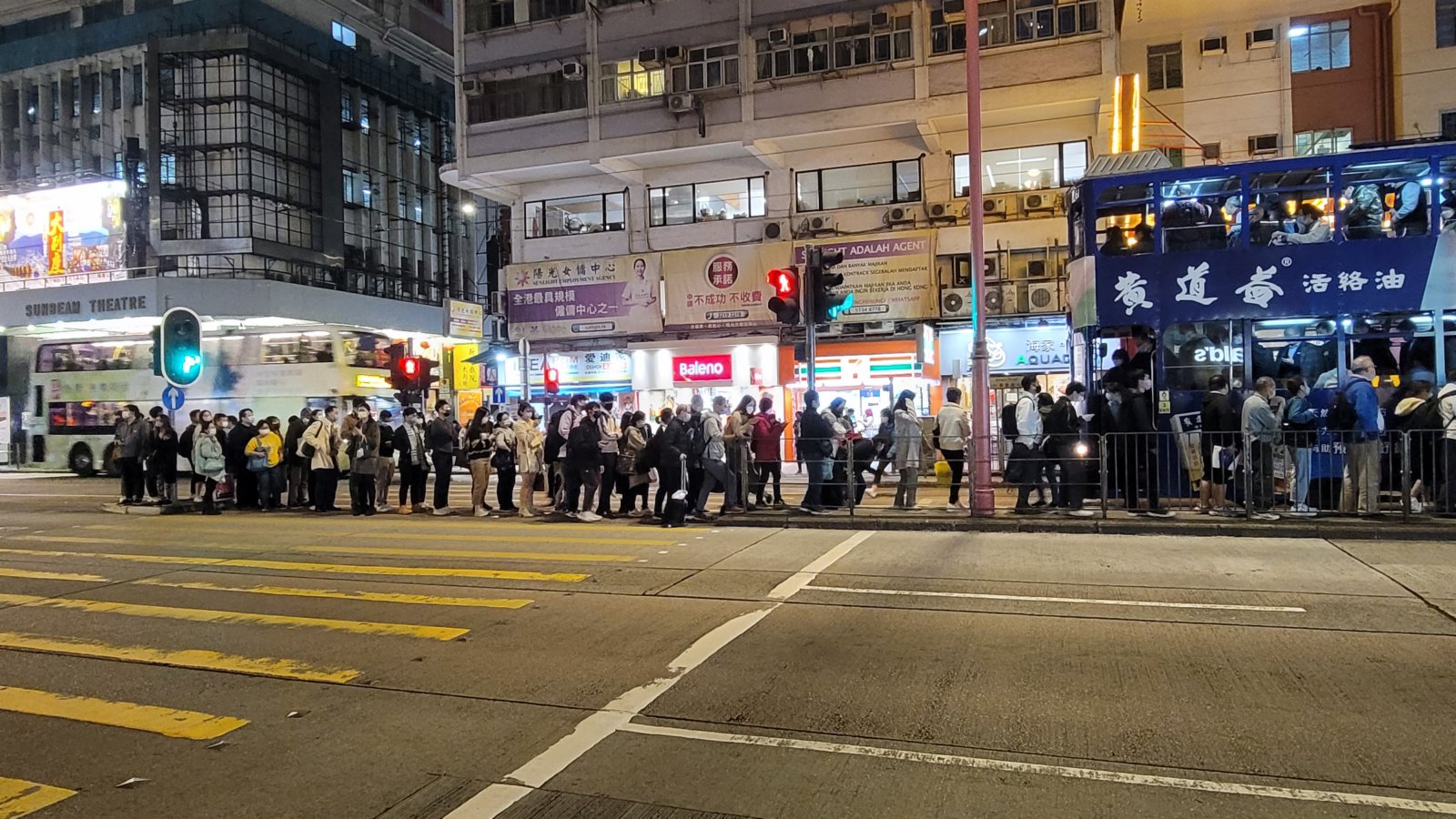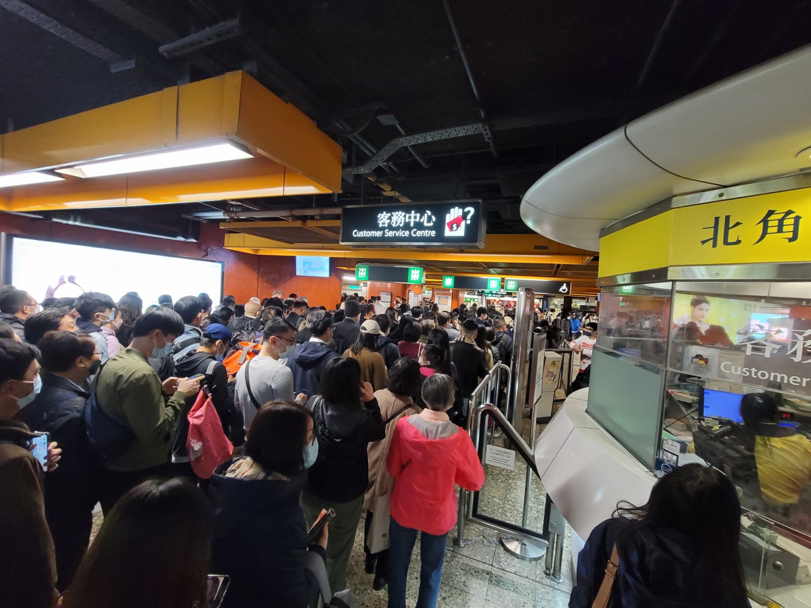 因港鐵列車故障,北角站不少乘客轉乘地面交通工具,新光戲院對開電車站排滿候車市民。