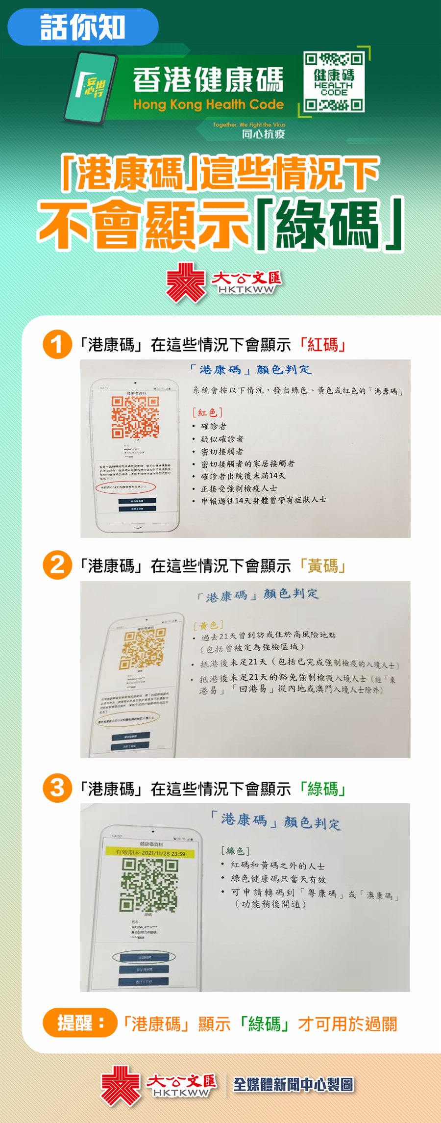 「紅碼」和「黃碼」之外的人士,「港康碼」才會顯示「綠碼」。政府提醒,綠色健康碼只當天有效,可申請轉碼到「粵康碼」或「澳康碼」(功能稍後開通),可用於免檢疫前往廣東或澳門。