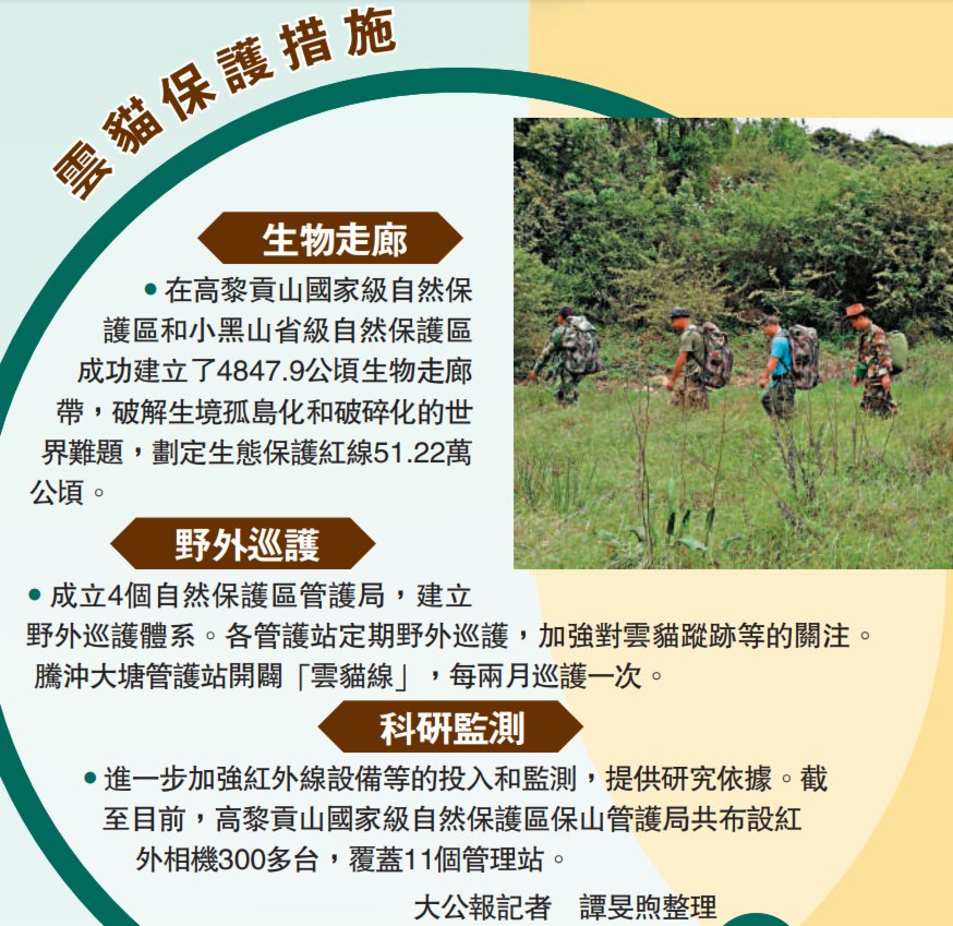 雲南高黎貢山國家級自然保護區保山管護局騰沖分局大塘管護站張興超說:「建立了12條監測線,布置了80台紅外相機。在監測過程中,每條監測線上都發現了雲貓的身影,還有兩處拍到了雲貓的幼崽,說明雲貓在我們保護區種群數量一直在增加。」