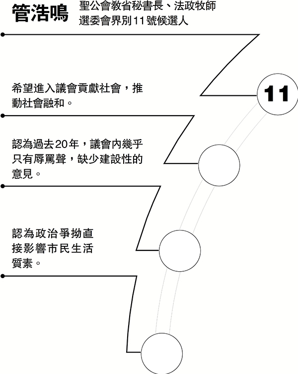 聖公會教省秘書長、法政牧師管浩鳴成為立法會選舉選委會界別11號候選人,顯示新選舉制度下的立法會對宗教界有心人具吸引力。管浩鳴接受香港文匯報訪問時表示,香港宗教界是社會上最大的持份者之一,在諸多領域,宗教團體都扮演重要角色,他希望進入議會貢獻社會,推動社會融和,重拾大家的愛心,減少仇恨,一切以家和為貴。