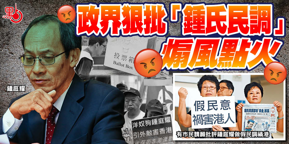 大公文匯全媒體報道:「鍾氏民調」一直傾向於反政府,昨日又公布所謂民調,稱反對口岸投票的受訪者佔一半,又聲稱屆時不會去投票的受訪者佔40%。多名政界人士批評「鍾氏民調」立場偏頗,沒有代表性,亦欠缺公信力,有人認為香港民意研究所(民研)主席兼行政總裁鍾庭耀等人,是假借學術之名,企圖影響選舉。