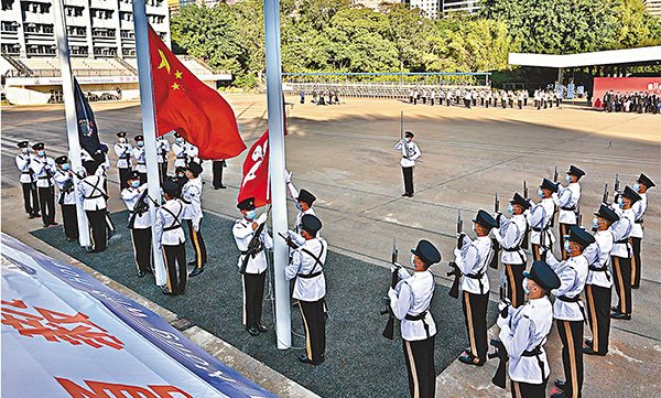 在昨日「國家憲法日」,香港特區政府保安局轄下6個紀律部隊,包括警務處、入境事務處、海關、懲教署、消防處及政府飛行服務隊,於昨日上午8時分別舉行升旗儀式,藉此展現愛國情懷和提高對國家的歸屬感,相關部門首長均有出席觀禮。警務處處長蕭澤頤昨日強調,警隊是維持國家安全的先鋒,大家要不負所託,竭力承擔起維護國家安全這個神聖的責任。