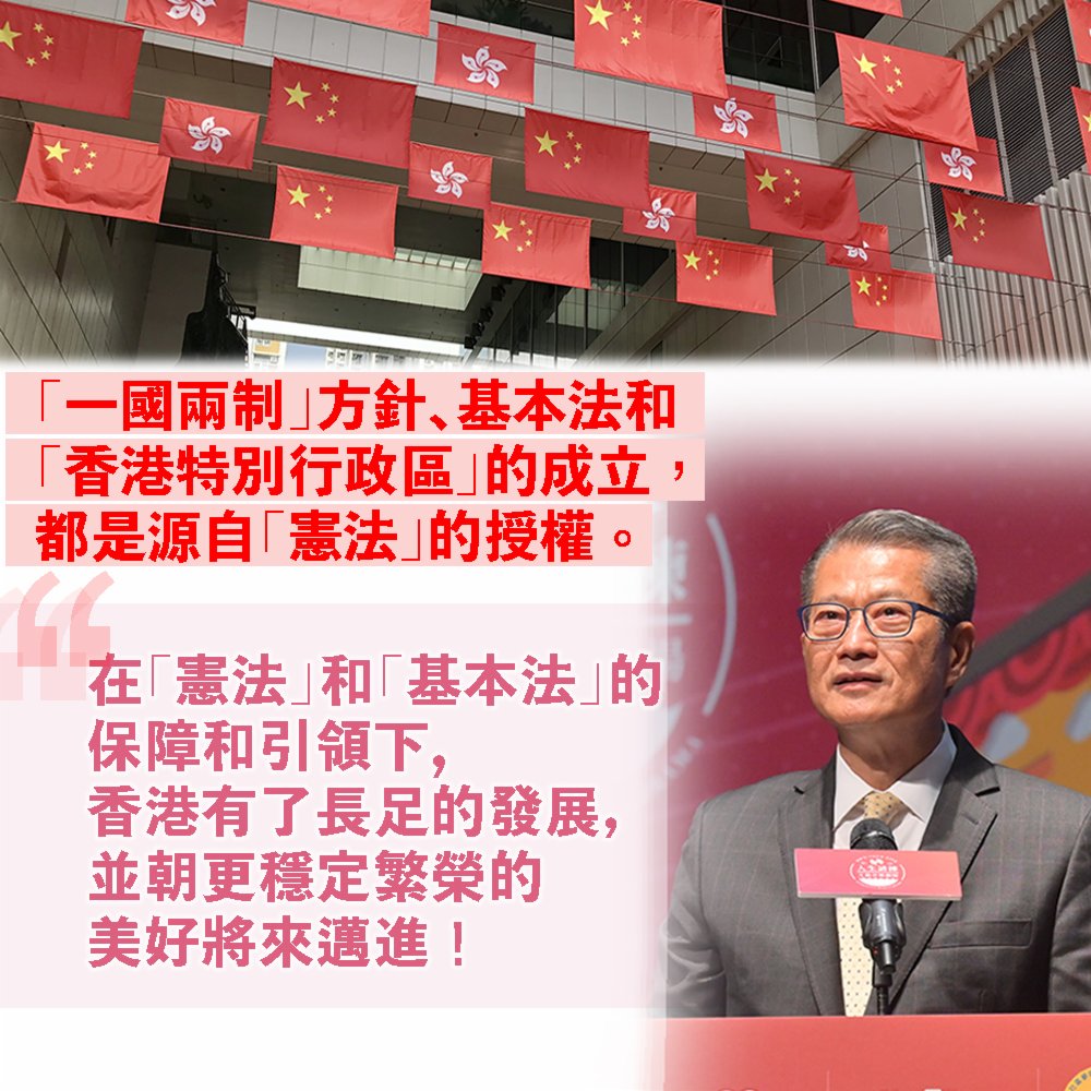 陳茂波強調,沒有《憲法》的授權,就沒有「一國兩制」和《基本法》,也就沒有香港特區的成立,更沒有香港回歸時的平穩過渡和政權順利交接。《憲法》和《基本法》是香港法治的基石。正確認識及了解《憲法》,更有利於我們全面、準確認識香港的憲制秩序及「一國兩制」的原則。明年是香港回歸二十五周年,「一國兩制」讓香港有了長足的發展,並朝着更穩定繁榮的美好將來邁進。