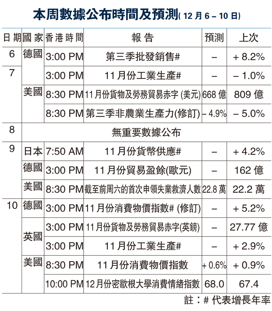 在Omicron變種病毒株不確性揮之不去之際,市場人士在評估美聯儲鷹派立場更加堅定的相關風險。儘管全球各國迅速收緊邊境管制,但Omicron變種病毒株已迅速蔓延至澳洲、英國、日本和美國等地,傳染性可能明顯高於以往的新冠病毒變種,有可能扼殺剛剛起步的全球復甦。在此背景下,美聯儲主席鮑威爾在上周三向國會作證的第二天重申,他和其他決策者將在12月14至15日的會議上考慮加快縮減刺激措施的步伐,這可能為提前加息敞開大門。美聯儲官員在上周四發言力挺主席鮑威爾的鷹派立場,舊金山聯邦儲備銀行總裁戴利說,現在可能是時候「開始制定一個計劃」以提高利率打擊通脹了,里奇蒙聯儲總裁巴爾金也對「政策正常化」表示支持。這使美元上周明顯獲見支撐。貨幣市場認為,美聯儲在6月會議上將目標利率提高0.25個百分點的幾率很高。而上周五公布的數據顯示,美國11月非農就業人口增加21萬人,遠低預期的55萬人;失業率也從4.6%降至4.2%,為2020年2月以來的最低水平,薪資年率4.8%,預期為5.0%;數據一度令美元回跌,但隨後已見重新走穩。