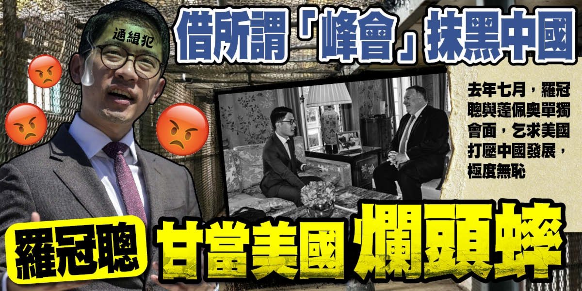 近年來,美方動輒以香港民主的「守護者」自居,真實企圖是以「民主」之名搞亂香港。炮製涉港法案,悍然實施制裁,污衊詆譭特區事務,包庇支持反中亂港分子,多邊串聯施壓……美方一系列政治操弄,是在干涉中國內政、破壞香港民主。羅冠聰對香港和祖國的背叛,在那些聲稱要遏制中國的美國政客眼中,卻擁有「獨特價值」。他們一再動用這個提線木偶,將其包裝為「民主鬥士」,在其赴美竄訪時予以會見,為其兜售「港獨」主張、散播政治謊言、抹黑香港國安法和中央對港政策提供平台,這是美國干涉香港事務、支持反中亂港勢力的鐵證。