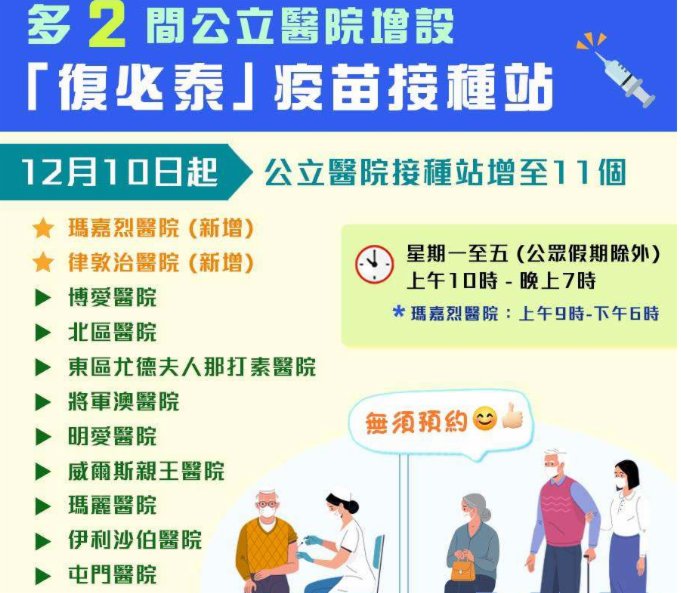 - 星期一至五(公眾假期除外),上午10時至晚上7時(瑪嘉烈醫院接種站上午9時至下午6時開放)