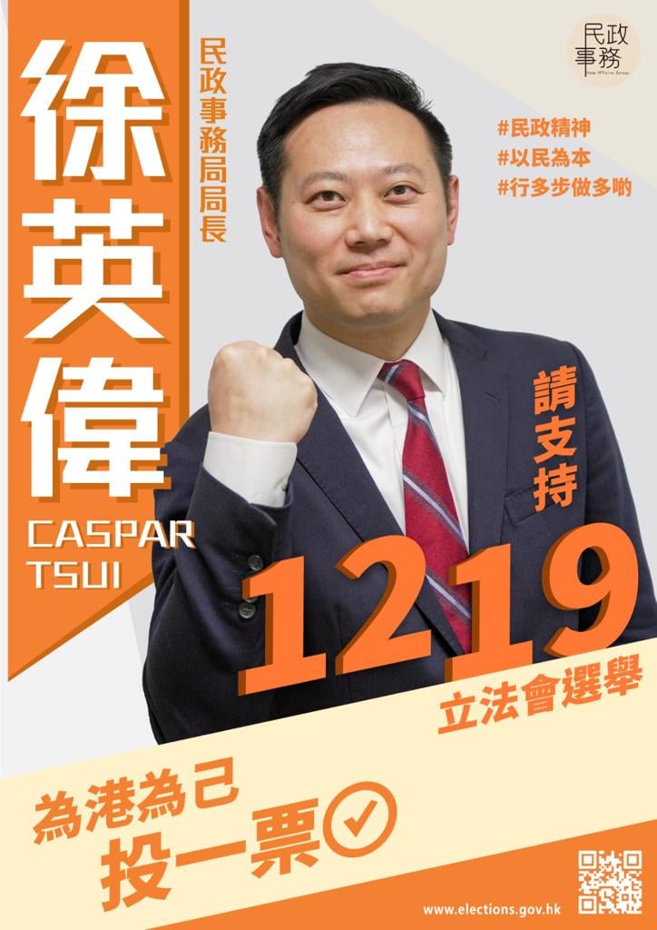 大公文匯全媒體報道:完善選舉制度後的首場立法會換屆選舉將於下周日(19日)舉行,多名司局長今日(12日)都在網上呼籲市民踴躍投票。而民政事務局局長徐英偉更別出心裁,在社交平台發帖,放上以自己為主角的「候選人」單張,提醒市民記得投票。